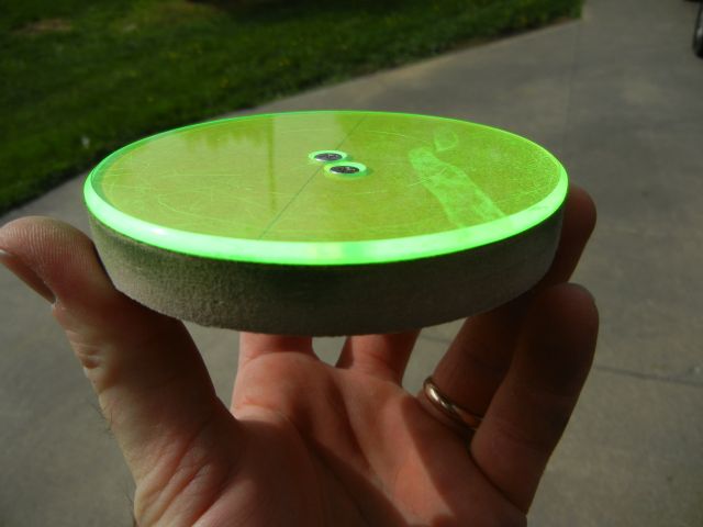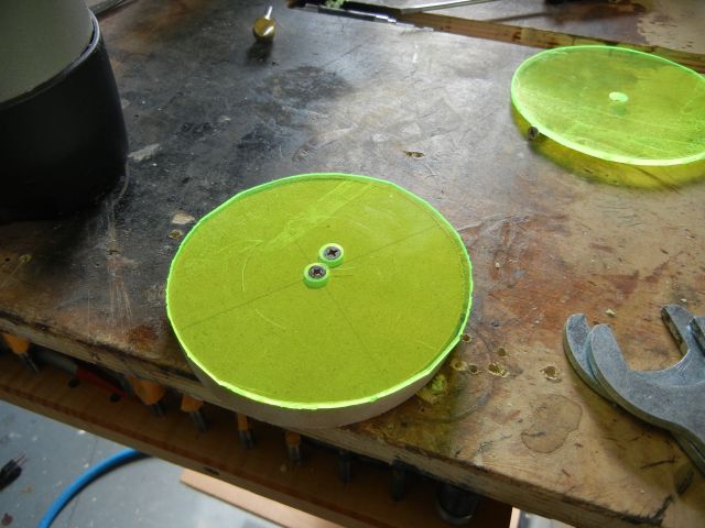 The first thing I did was use my router to cut out a 4" circle out of 1/2" mdf. Next I cut two blanks out of the green plexi just slightly oversized above 4".