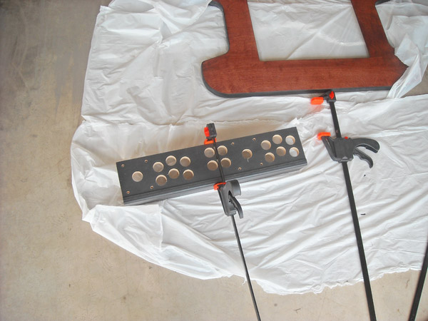 Attaching the P1 control panel housing. Notice the growing pile of broken ratchet clamps in the background. These things should have come with a warning sticker: "WARNING: this item is for decorative purposes only. Any attempt to actually tighten the clamp onto wood will result in the cheap plastic housing flying apart and the trigger falling off."