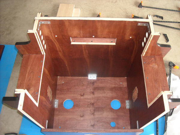 Attaching the piece that Arcade Depot provided to connect the rear hinged panel to the top panel. I used glue here in addition to the provided screws.