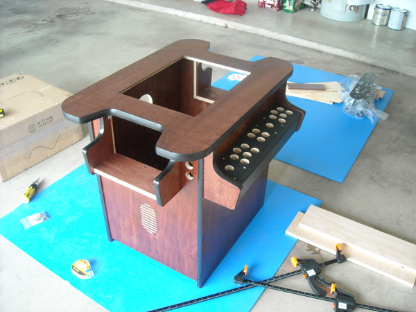 I'm in the middle of down-sizing a full size cabinet (Lucid's design) to a cocktail.  I've looked at the trade-offs between pre-assembled (mikesarcade.com), kit (arcadedepot.com) and scratch built (me).  Based on your pictures, I think the arcadedepot.com is the way to go (although I'm a bit worried about communications).  Can you tell me what color stain you went with and how much shipping was?  I don't think you mentioned either above.