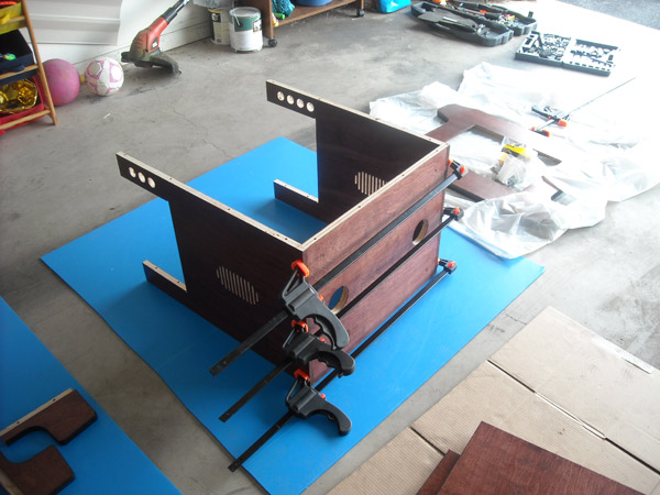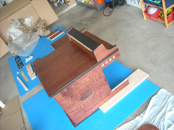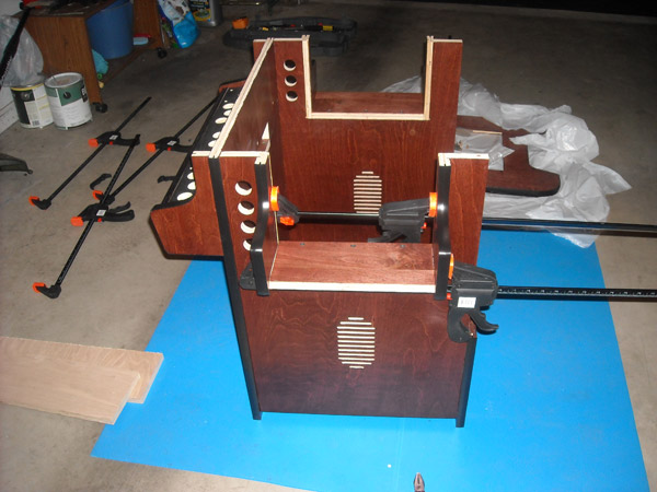 Attaching the P1 control panel housing. Notice the growing pile of broken ratchet clamps in the background. These things should have come with a warning sticker: "WARNING: this item is for decorative purposes only. Any attempt to actually tighten the clamp onto wood will result in the cheap plastic housing flying apart and the trigger falling off."