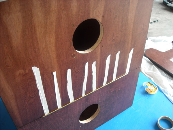 And now for the biggest pain of the assembly: attaching the hinged portion of the back panel to the piano hinge. It was a ---smurfette--- figuring out how to get it lined up just right. What I did was fed masking tape through the slots in the piano hinge, then closed the hinge and set the panel into place in the closed position, then tightened up the tape. This allowed me to open it with the tape holding it just enough that I could then install the screws.