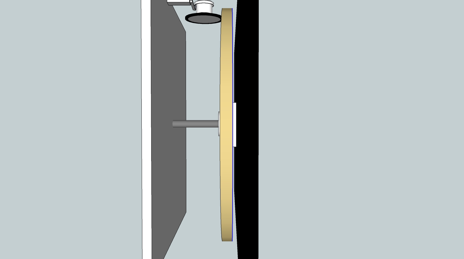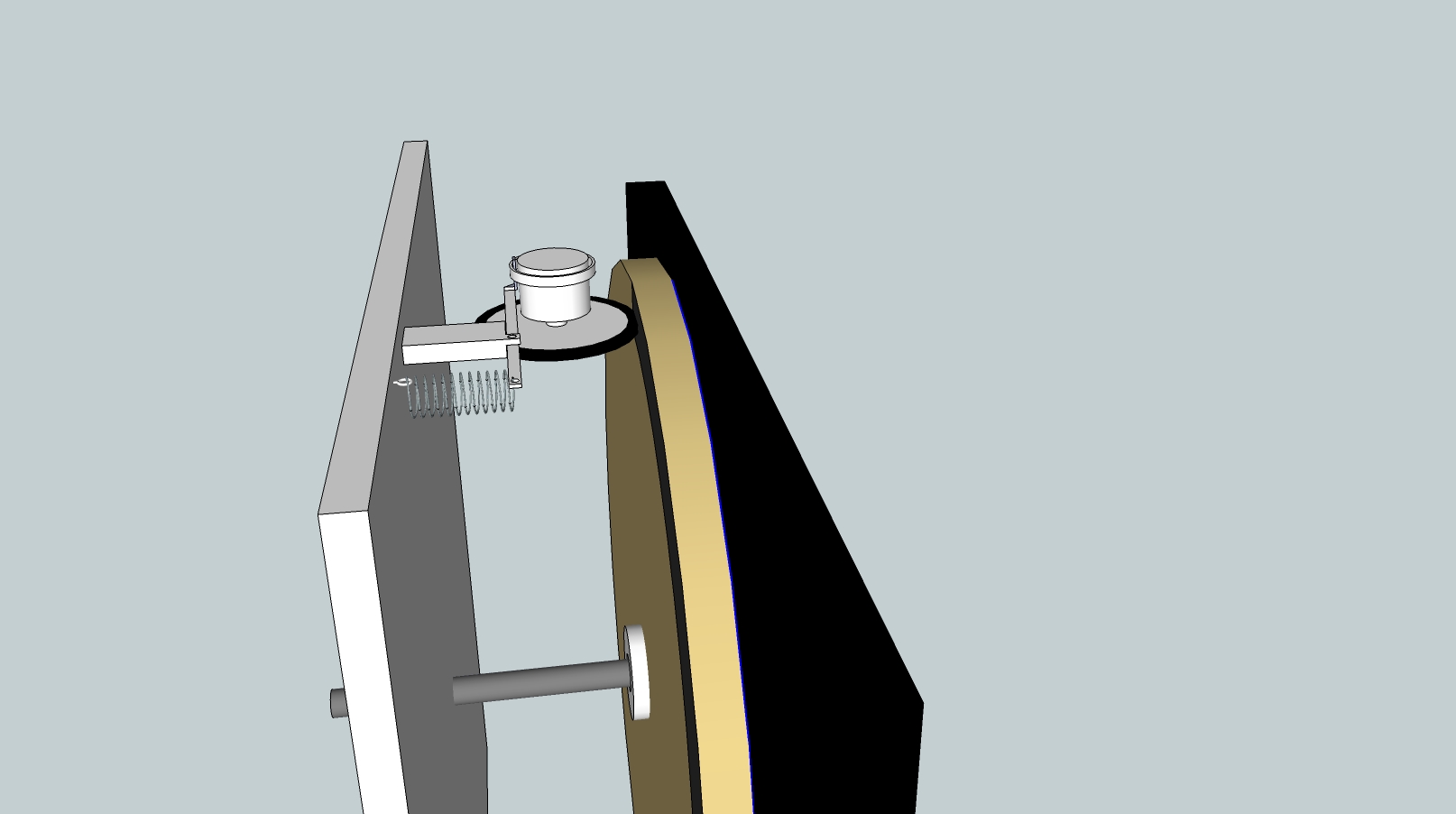 The nice part about this mechanism is, it not only makes up for the wood movement, but it also compensates for run-out of the mdf circle and absorbs some of the shock when the mechanism hits the stops. I also glued some 600 wet/dry sandpaper with super 77 trim adhesive to the back of the circle where the wheel of the motor contacts it, for added friction.