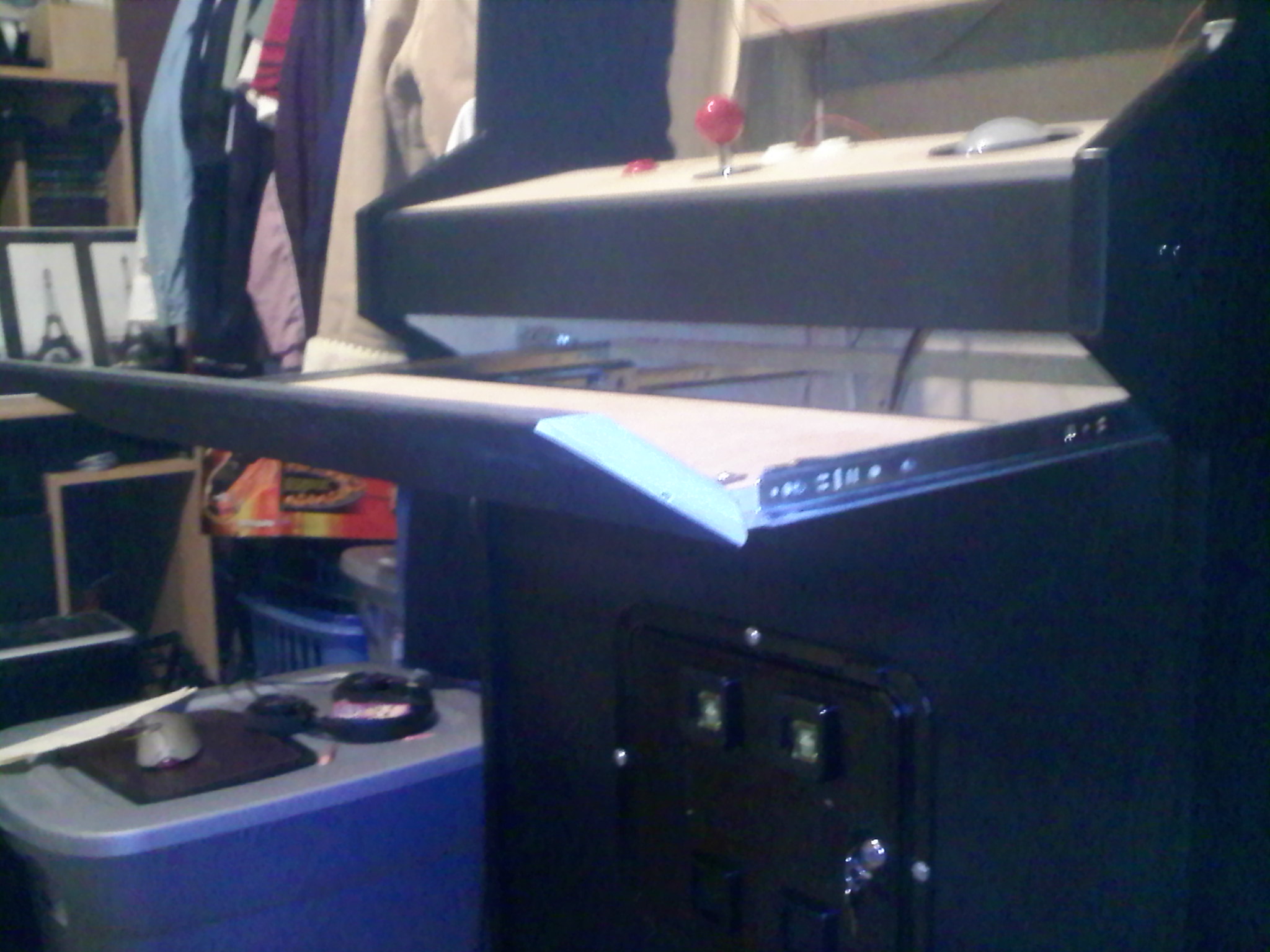 http://groovygamegear.com/webstore/. I didn't really know how to use a router properly, so when I tried to cut the slot for the t-molding, I tried to do it in one pass. I burned the wood cutting the slot, to the point of filling my garage with smoke. After that I made several shallow passes with the router and that worked MUCH better. Also when I tried to cut the hole for the trackball with the jig saw, I had problems with blade deflection again, so I just made a jig for the router to cut the rest of the holes I needed, speaker holes, fan holes etc. A word of caution about the router, make sure you cutting in the “right” direction, other wise it tries to take off on it's own. I found this out the hard way and almost ruined the hole I was cutting for the coin door, not to mention scaring me half to death. Fortunately the coin door completely covered the gouge. After that experience I did a lot more reading about safety with wood working, I found these sites to be quite helpful