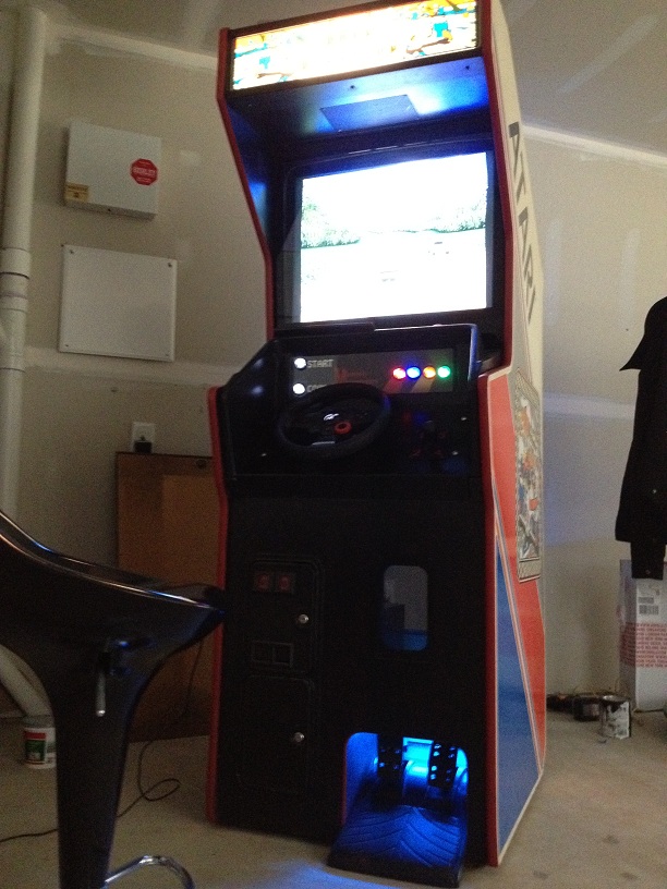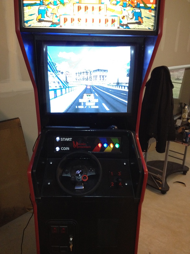 The angle of the wheel is actually really good, but Im too tall for the cab to race for long periods of time, I race comfortably from a stool. My only regret really is using a PS3 wheel instead of genuine arcade parts, but this was so much easier. If you have the skill I say got for the custom panel, I just didnt want to sink anymore money into this :)  If you have any questions or want any specific pictures of anything, let me know.