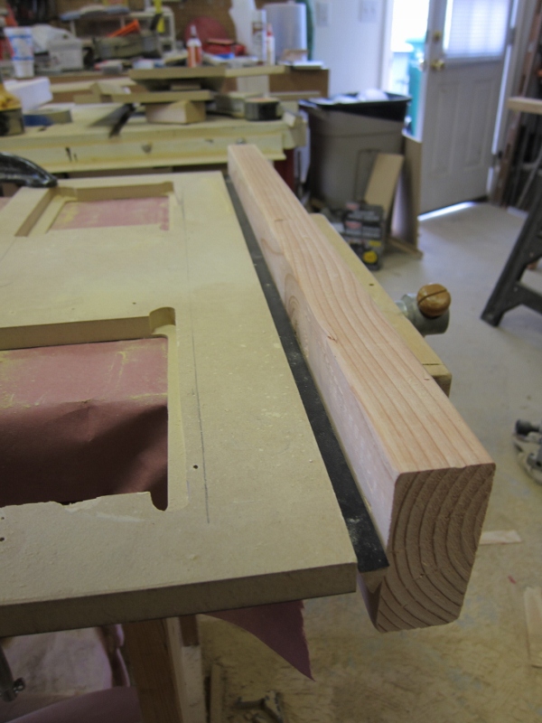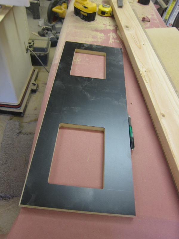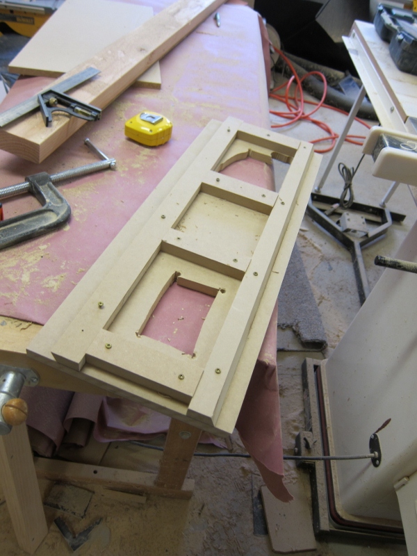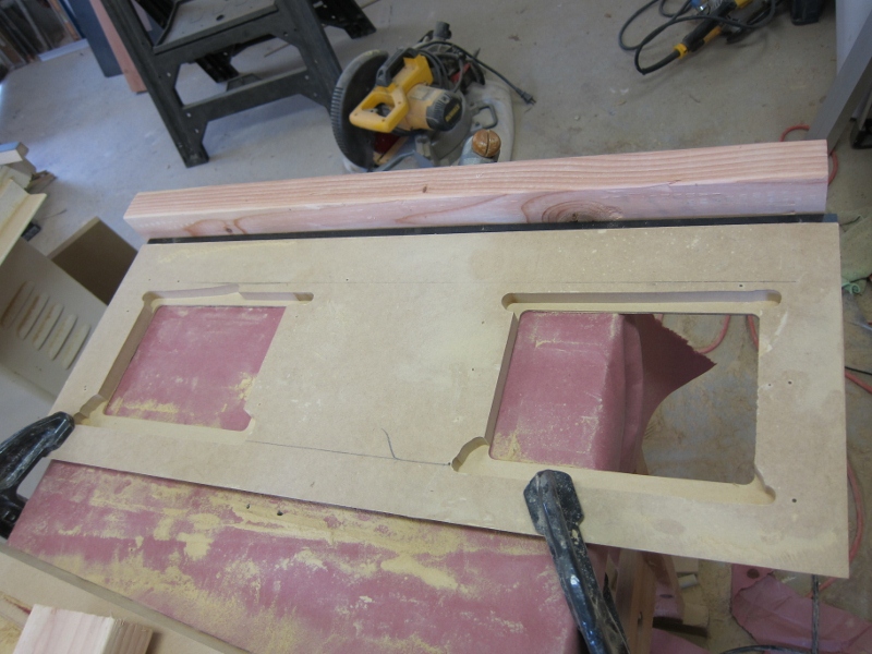 I tried using an old 5x7 picture frame as a jig but that ended up being a major fail.  I decided to make a jig using strips left over from cutting the cabinet.
