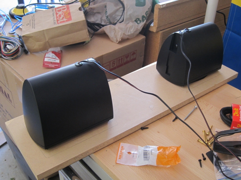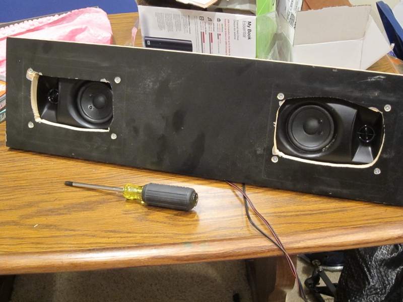 I took a scrap piece of MDF and cut holes for the speakers. As in Saint's book I drilled holes through the work piece, removed the screws holding the speakers together and used longer screws to attached the speakers to the work piece.
