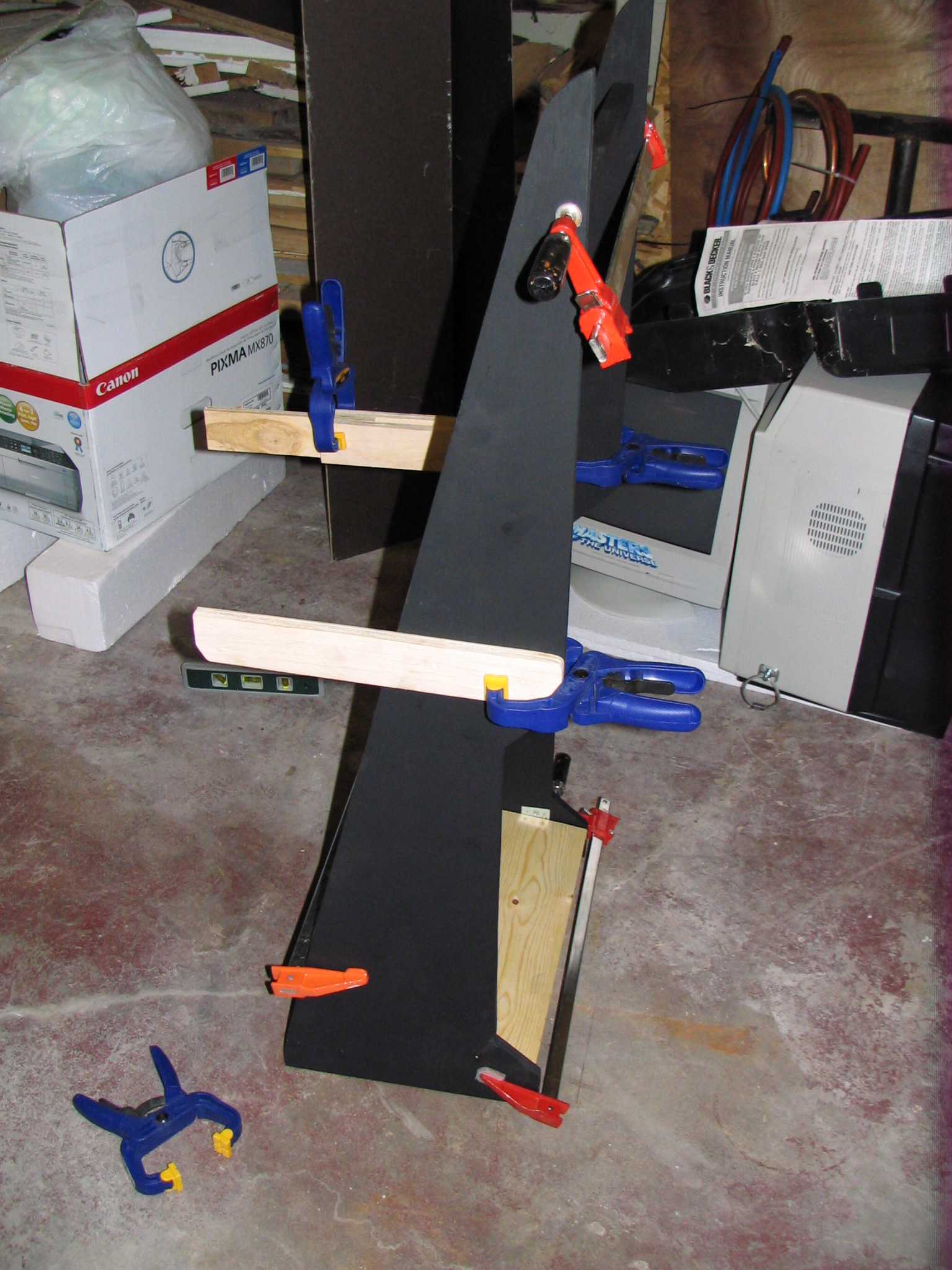 OK, now it is time to start fitting the parts together. I put some brackets down, some firring, since I am bracket-aholic, but I still am clamping. I started priming my pieces. That's why some are black. Those two plywood rectangles, they are on the front. To keep the design simple, I just overlapped them like shingles. Easy and effective. Remember that spare 2 inches of wood from the Control Panel piece and the Gauntlet jut? Those went to make the arms that hold the control panel in place.