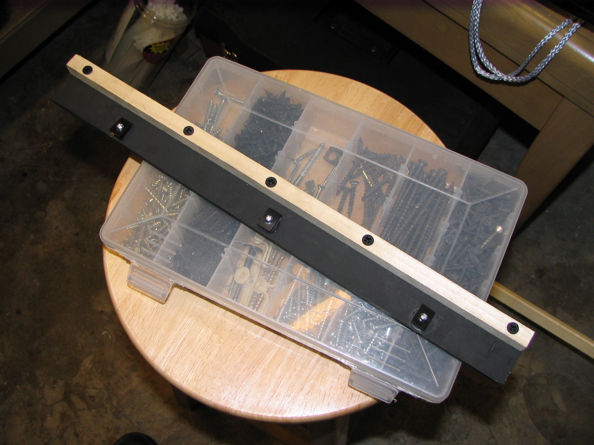 For the top of the cab, I just screwed a flat dowel to a square dowel, then shoved some clips on it for the marquee. I could do the same with the bar for the bottom of the marquee, but I was running out of doweling, so I just am using a piece of cap moulding.