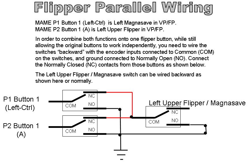 EDIT: Just realized that when I posted in this thread, I forgot to attach the diagram for how to wire P1B1 and P2B1 in parallel to one button for left upper flipper/Magnasave while still allowing them to operate independently.