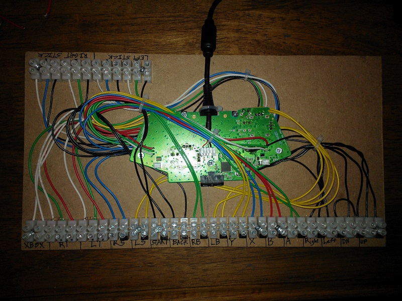 Wiring done today.  Not a lot of space to spare inside.  I forgot that the triggers and xbox button don't share a common ground with the rest of the buttons, so ended up with a few extra terminals on my ground chain.
