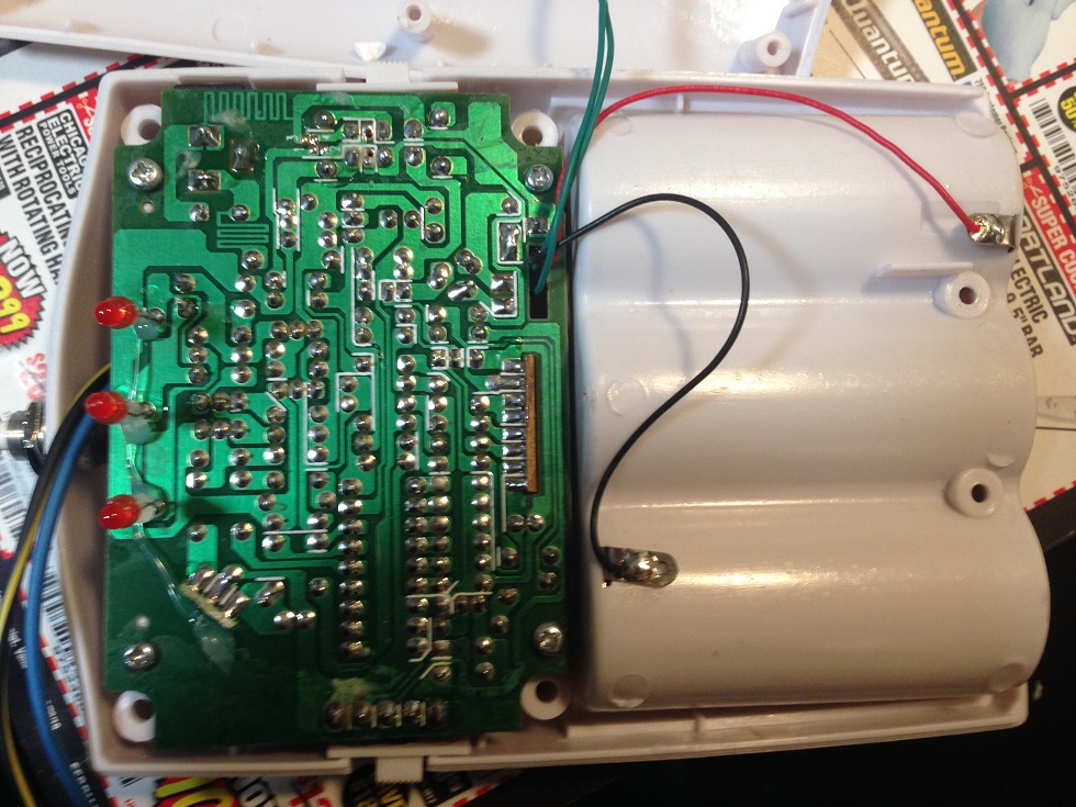 Switch mounted and circuit board put back in place. i ran the switch wires out so i can get to them. Notice the 3 C cell battery compartment.
