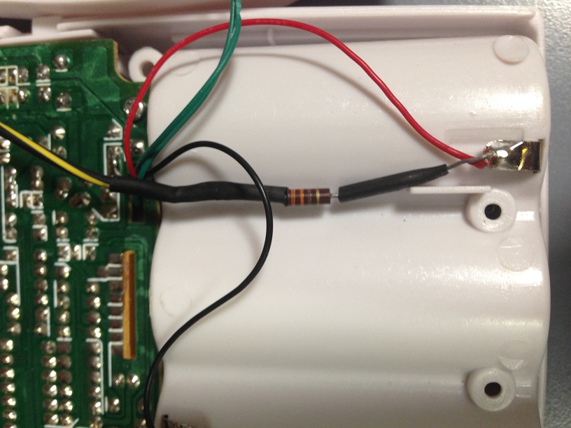 I then soldered a 330 ohm resistor in one of the wires going to the reset switch, and the other end of the resistor to the POS (+) terminal on the battery compartment.