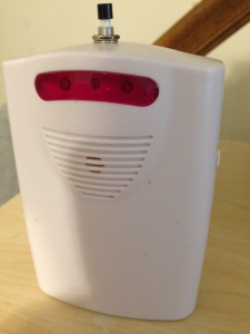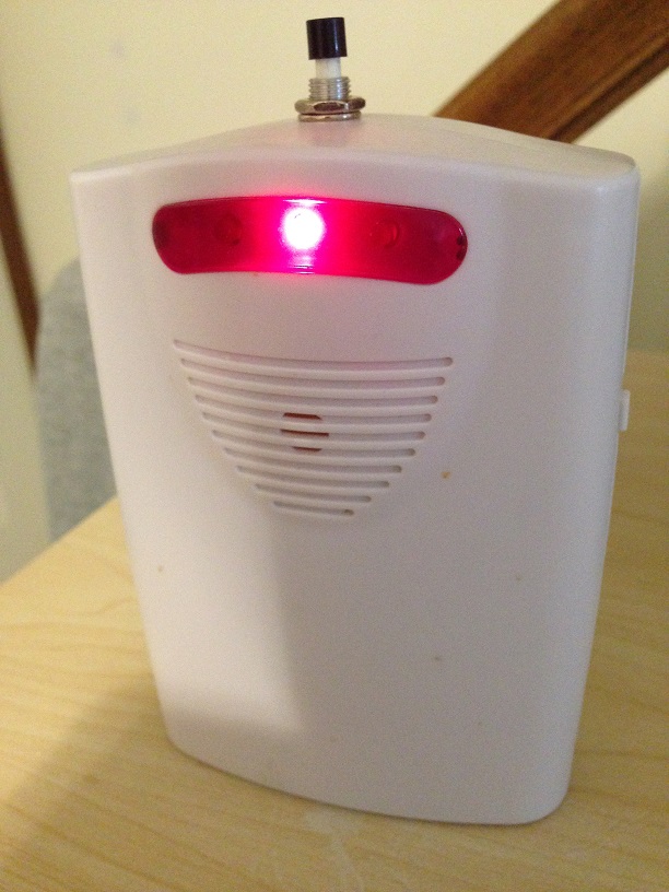 When someone pushes the outside button by the door, the downstairs door bell rings and the wireless button is energized, sending a signal upstairs and ringing that one too.