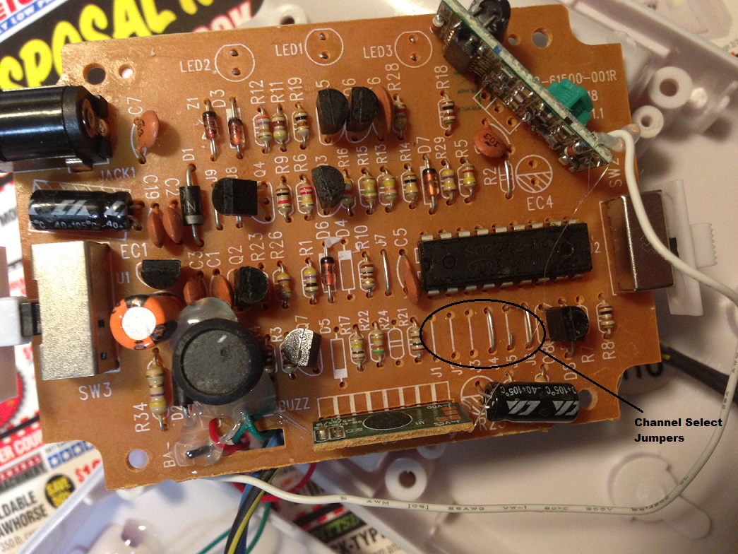 Here is the receiver board removed from the enclosure. I marked the jumpers that are used to set the channel. The transmitter has the same jumper layout, so you can have more