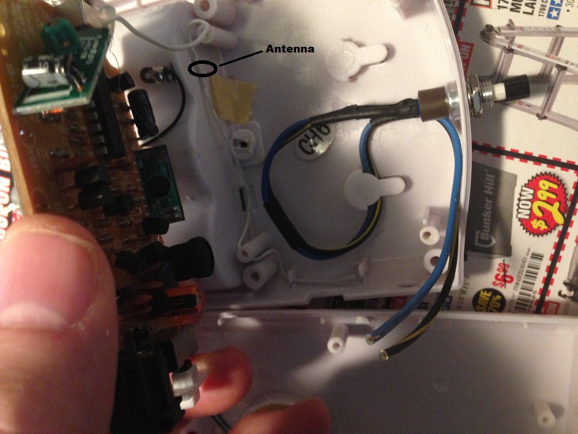 I suppose the spring could be de-soldered and a piece of wire soldered back, so the antenna could exit out of the back of the metal mail box, like I did the first time.