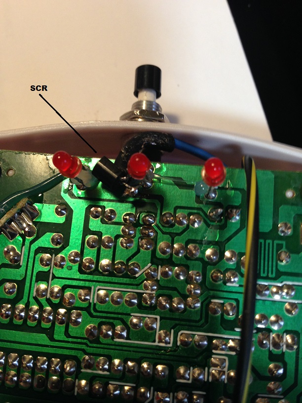 The gate of the SCR soldered to the wire going into the board (was LED lead).