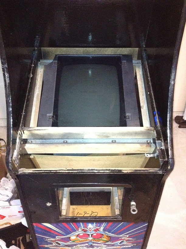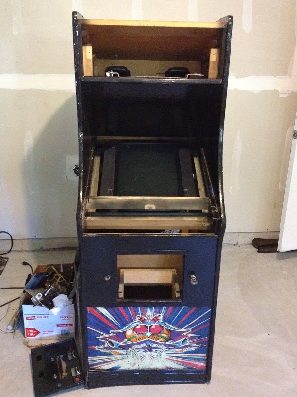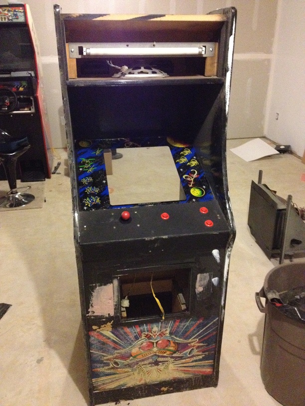 Its "kinda" a restore because its powered by a 60 in 1 board, its a restore to me because its all Galaga art and what not. First , the ugly. I overpaid for this cab because it was "working" and its my grail, my own fault. Gist is, the wiring inside was super ---fouled up beyond all recognition--- up. I couldnt get the Galaga to work and rather than destroy the board and everything else, I gutted it, wired it for Jamma and put in a switching power supply. The ENTIRE outside was covered in some kind of varnish or shellack, like a 1/4" thick coat , everything except the marquee and bezel plastic had a coat. The sides, the top, the back, the coin door.....EVERYTHING.
