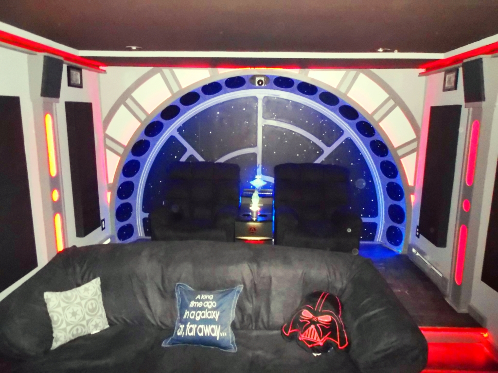 Like everything I do, I can't do it just once. In the original plans I had not given enough space for the second row of chairs. I only allotted 5' instead of 6'. Being 6'4", it quickly became apparent I was going to be using the front couch as a footrest. After living with it for awhile, I decided to move the wall back another 13" because that was all the space I had left to work with. As anyone who has done some home remodeling knows, moving a wall is a pretty big job, so I had to do something special to that back wall to make it worthwhile.