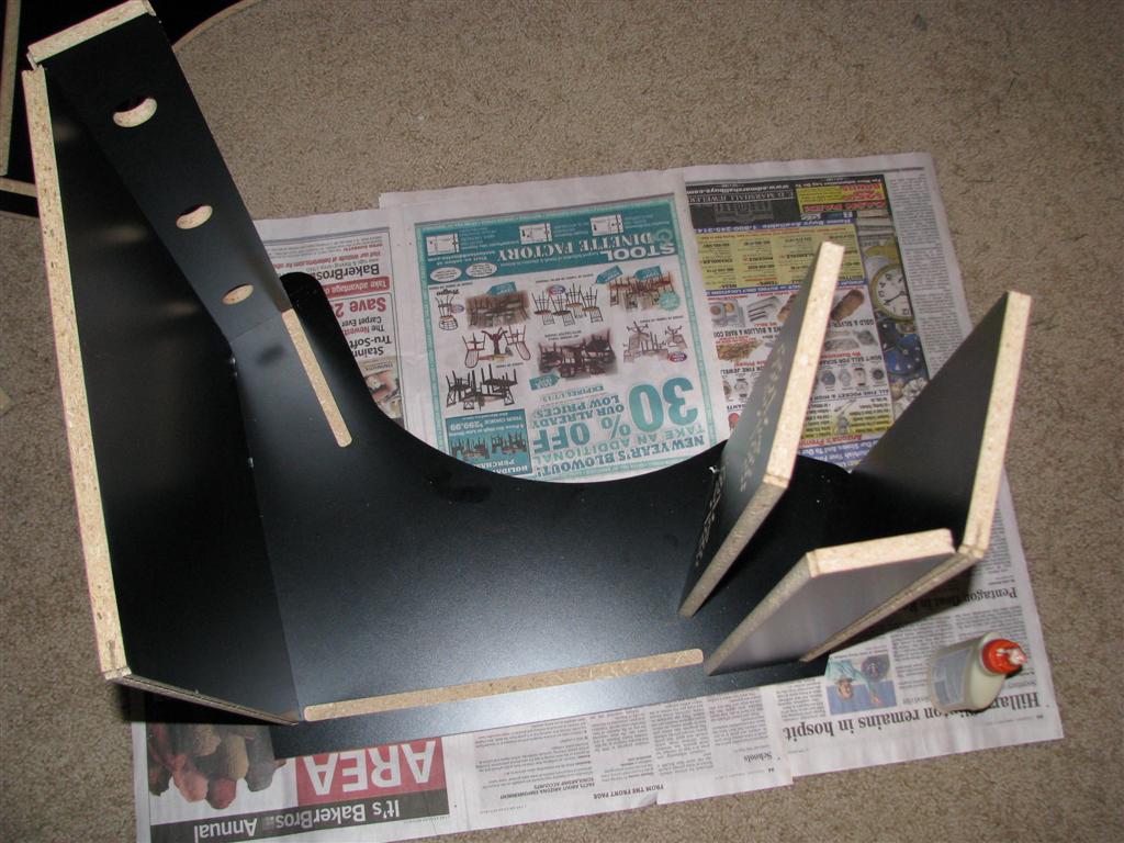 After the hour or so has passed, take the weight off the cabinet, and carefully remove the unglued side.  Place the unglued side down, fill the five 1/4" pockets with a liberal amount of glue, and carefully guide the tabs into place.  Again, set a weight on the assembled cabinet, wipe up the excess glue with a wet paper towel, and leave for ~24 hours in a warm place.