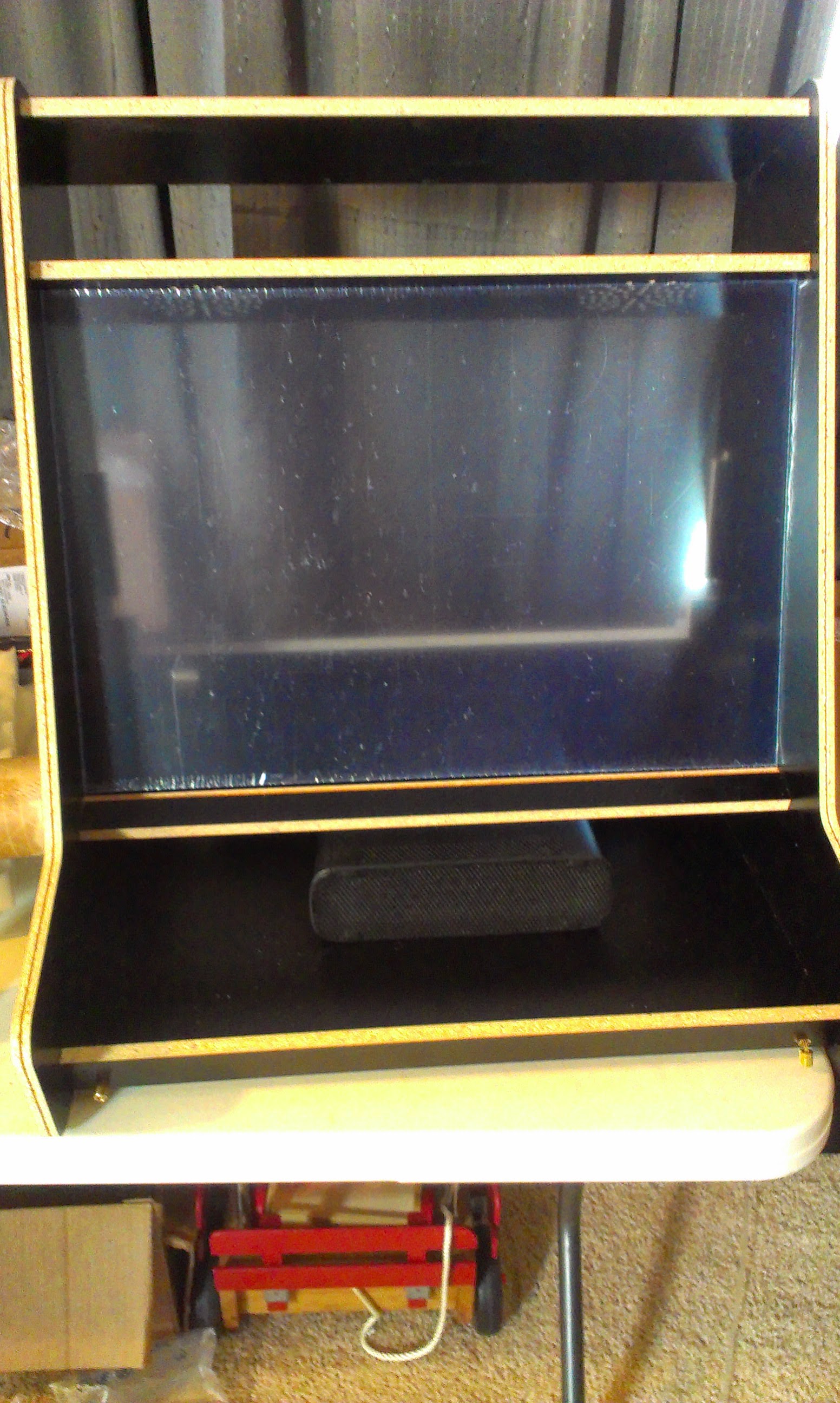 Front view, you can see the 360 sitting comfortably inside.  Also, plexi is resting on the plexi / control panel shelf.  Notice that little brass colored thing on the bottom left?