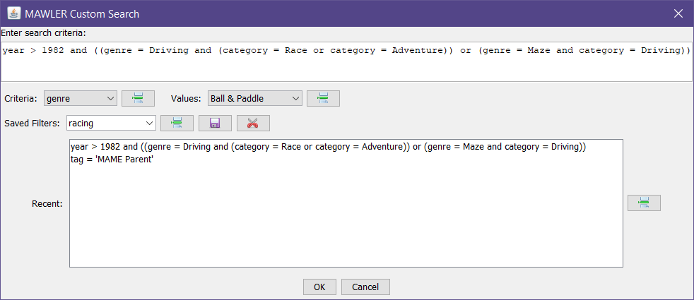 You don't need to know what all the various fields are called in this scriptable language, as the Criteria drop list provides them all, pick one and insert into your growing textual query.  And when you select a Criteria, all of its known Values are shown - again, you don't have to be an expert here, this screen will help you along.  And if you get something wrong it will tell you about it.  Also shown are all your saved queries, the ability to save what you have, delete a query, and review all recent searches.  Matching multiple values is also supported with shorthand syntax, like: