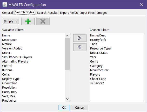 As shown in the next screenshot below, you can define which search criteria fields are shown along the left side of the main window.  You can create (green plus sign) a variety of your own criteria settings, remove ones you don't like (via the red "x" which is shown disabled and grey here as you cannot delete the built-in settings, just modify them), etc: