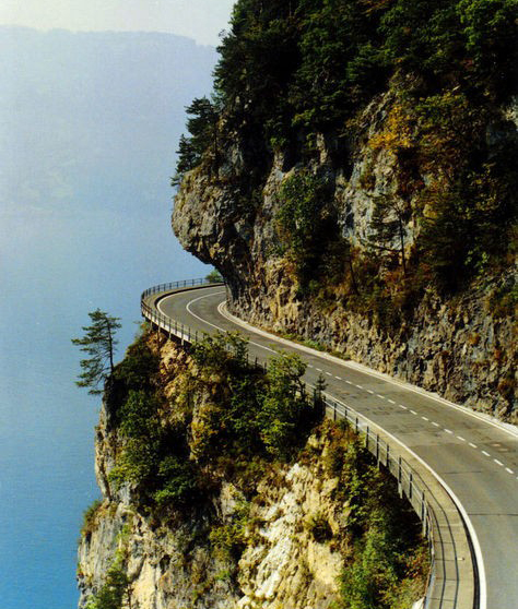 In my play, I drew the top left, to show a more proper scale.   Bottom right, I was playing with colors and a cliff concept.. high in the cloudy icy blue mountains.    Of course, I got the scale wrong on that one.  heh.   Which should be at least 2 cars width.. maybe a little shoulder too.   Would be interesting to see 2 way traffic as well.