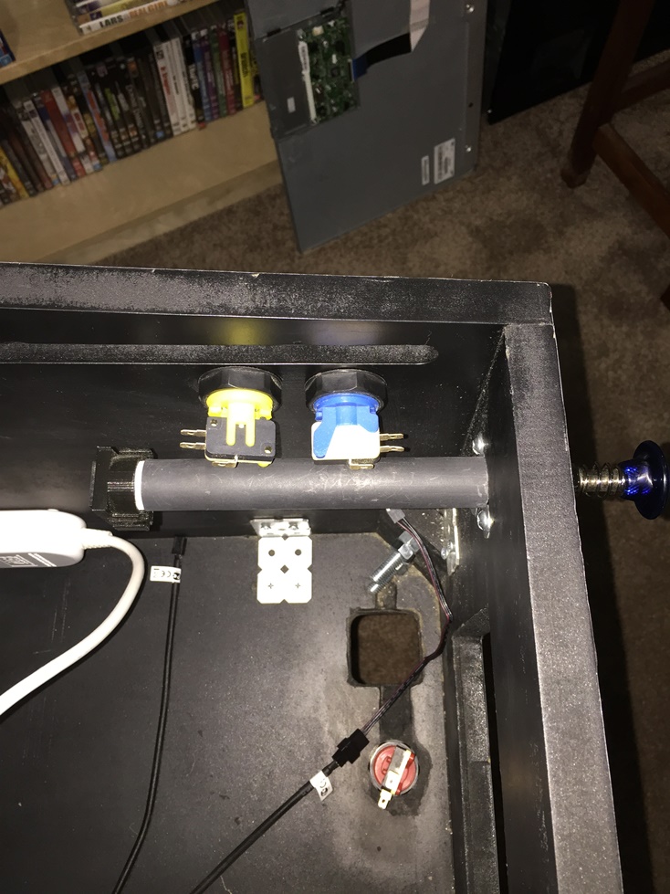 I cut the plug off the power board and hooked the wires up to a panel mount socket. Other work done on the back of the cab – installed a power button (connected to the PC on/off switch), and a panel mount USB for quick updates. Grills installed over the rear fans – I would have mounted them at 45deg, but the mounts were on the exact same diameter as the fan mounts and the screws would have fought for the same space. No big problem, but just doesn’t quite look right.