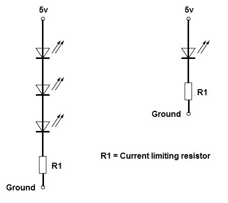 -- Left now has 5v applied to 3 LEDs in series. This results in a 1.67v drop across each LED = 0.17v over rated voltage.