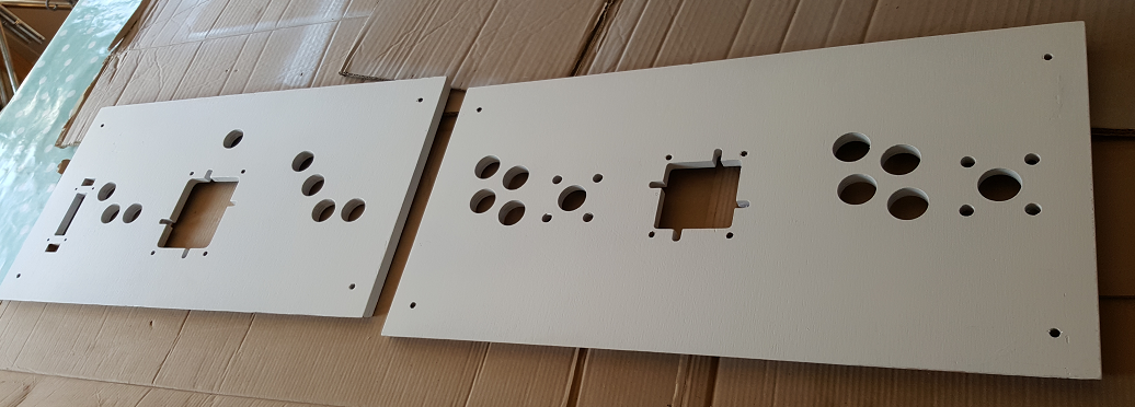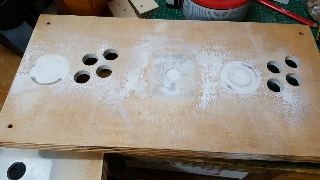 The two-player panel lines up perfectly - very happy! For the joysticks holes, I cut them very slightly smaller than the actual holes for some wiggle-room (1mm diameter smaller).  I plan to use a stanley blade to cut them perfectly around the edges of the holes once the artwork is applied...