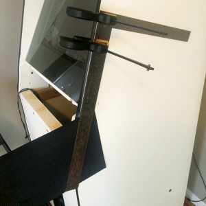 Using my router, some double sided tape and a straight piece of scrap wood, I flush trimmed all the straight edges. After I had the straight edges done, I found something round that fit the profile to help make the corners perfect. I double sided taped that to the MDF and used the flush trim bit to follow the curve and make nice clean corners.