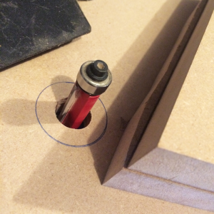 Using my router, some double sided tape and a straight piece of scrap wood, I flush trimmed all the straight edges. After I had the straight edges done, I found something round that fit the profile to help make the corners perfect. I double sided taped that to the MDF and used the flush trim bit to follow the curve and make nice clean corners.