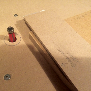 Using my router, some double sided tape and a straight piece of scrap wood, I flush trimmed all the straight edges. After I had the straight edges done, I found something round that fit the profile to help make the corners perfect. I double sided taped that to the MDF and used the flush trim bit to follow the curve and make nice clean corners.