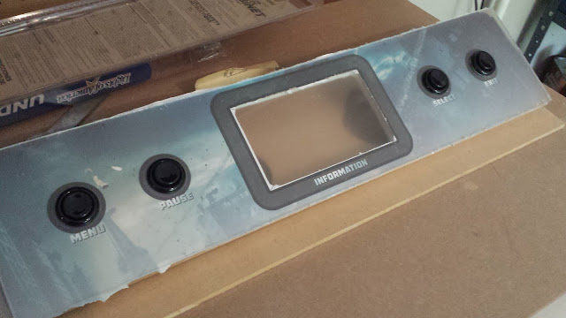 Then I took off the buttons & screen and am currently gluing the bottom trim piece on.  I taped the art so glue wouldn't ooze onto it.  Once it dries, I think I'll put a couple screws in it, just to be safe; since this trim will be right next to the control panel and subject to some wear and tear.
