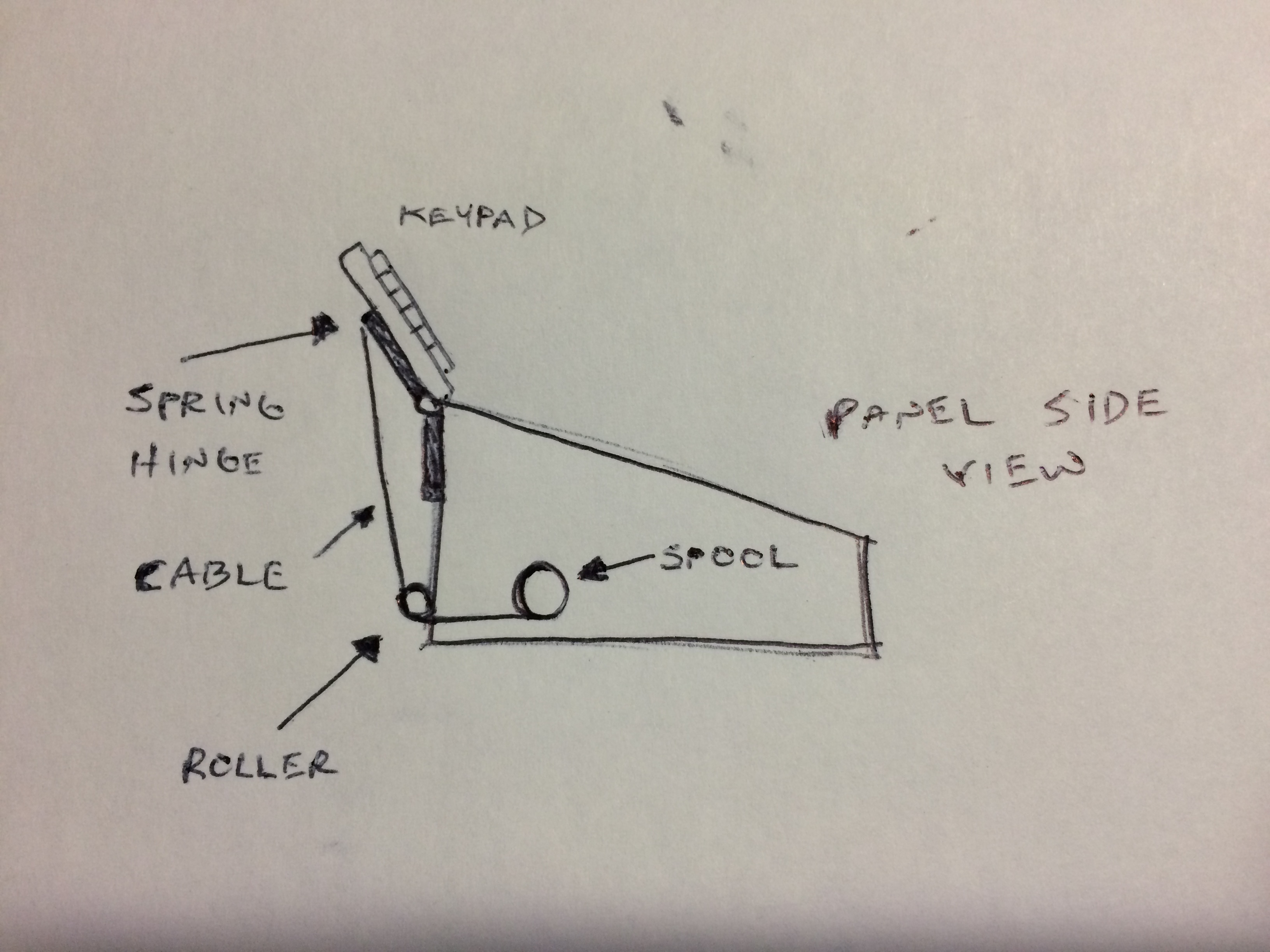 sketch is for the side view of the CP.  on the back is the colored in spring hinge and attached to that is the keypad.  from the top of the extended things is a cable that will feed thru a roller wheel so as not to get caught on the wood.  inside would be a spool that would pull in this cable, closing the hinge and pulling the keypad down.