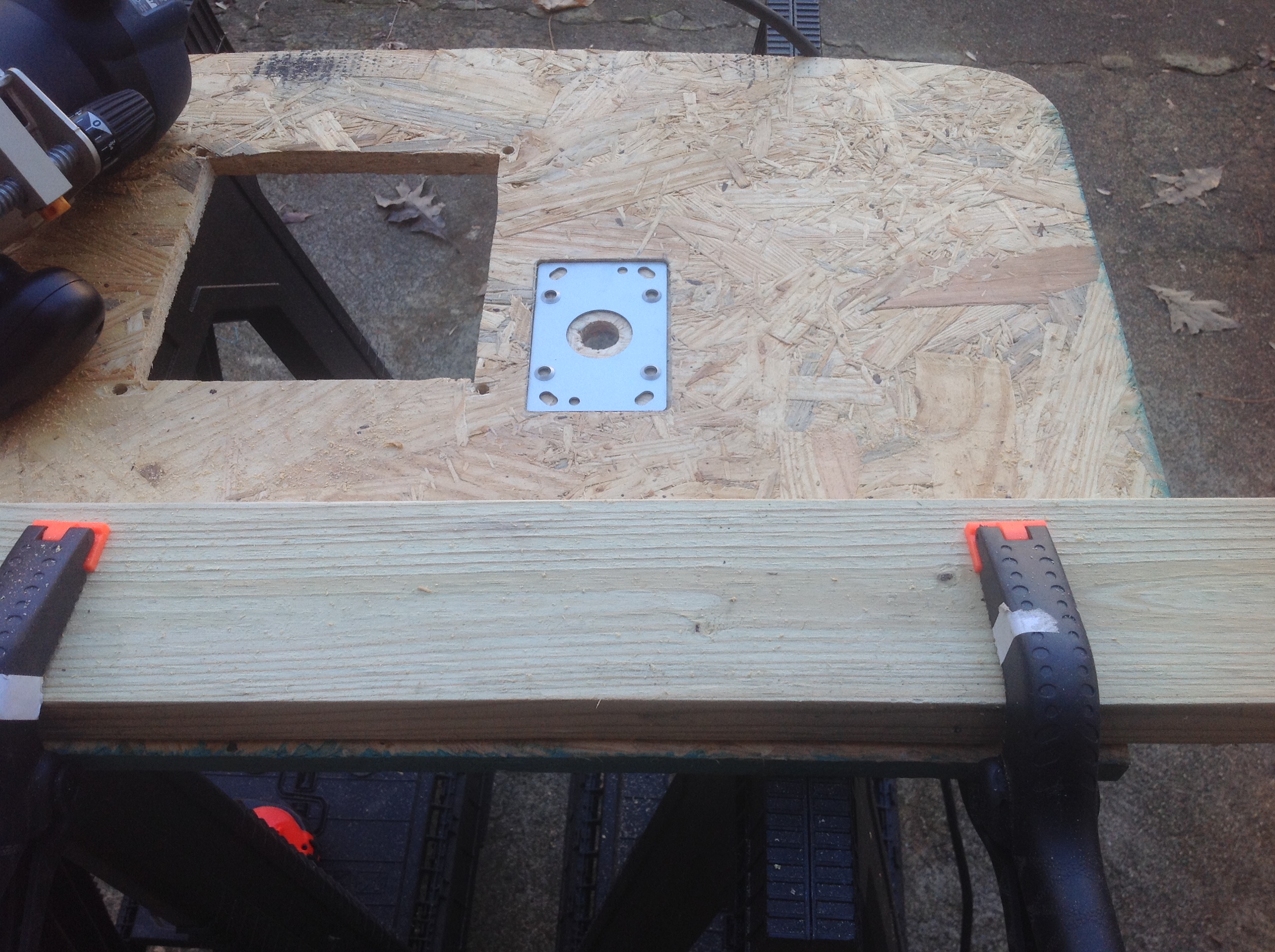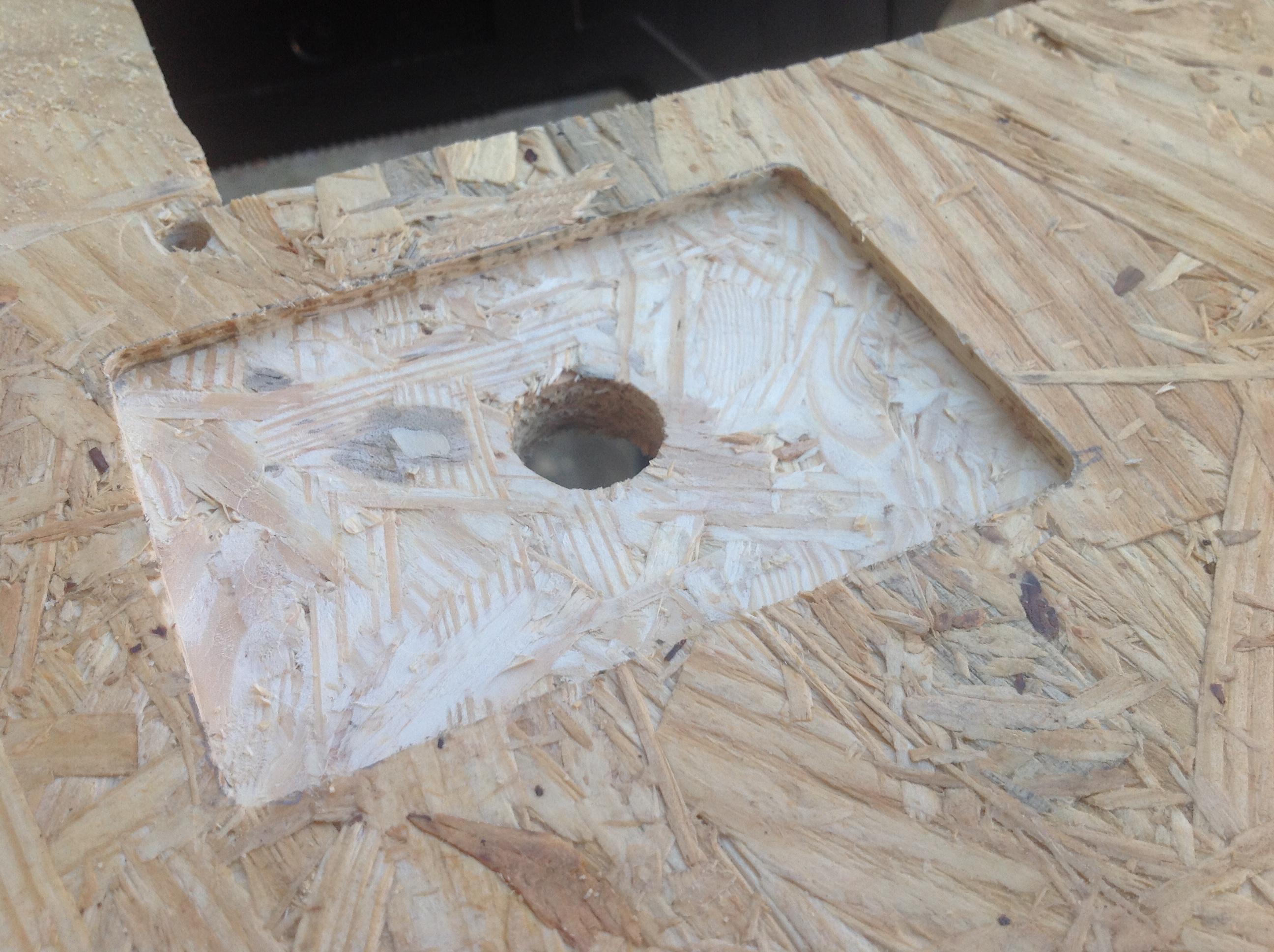 I had some spare OSB laying around, so thought I should practice on it. I laid the original CP on top, traced it, cut with a jigsaw, and there it was. Note that I did not recess the trackball mounting plate, as this is just a test.