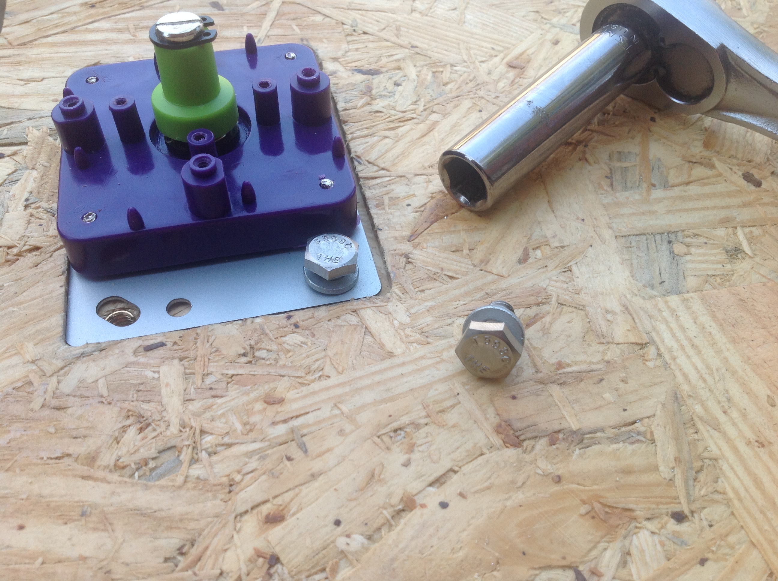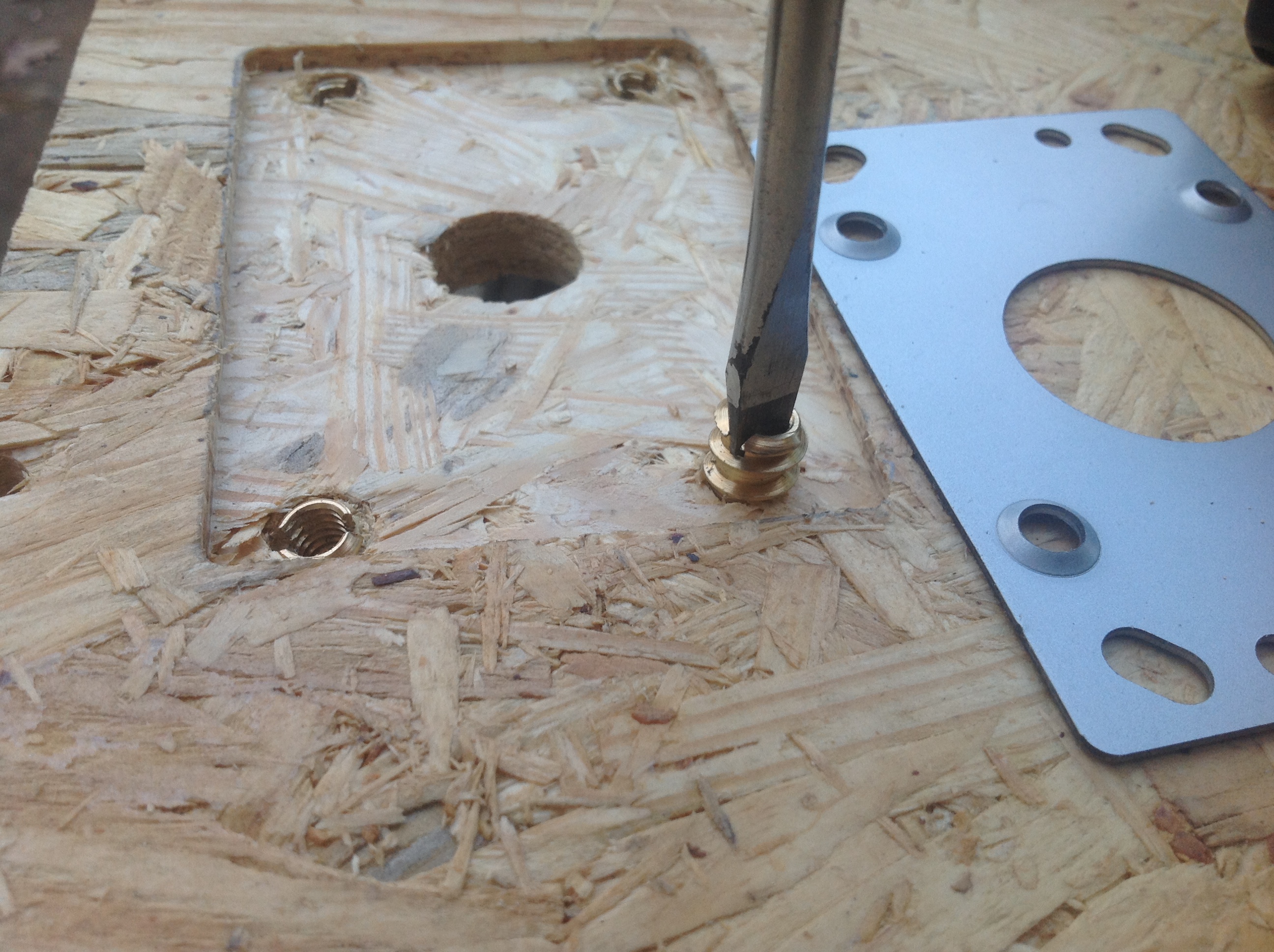 Note on the threaded inserts-- This piece of OSB is 5/8" thick. The original CP is 3/4" While the inserts show through from the top of this test panel, they should be hidden below 1/8" of the top on the final panel.