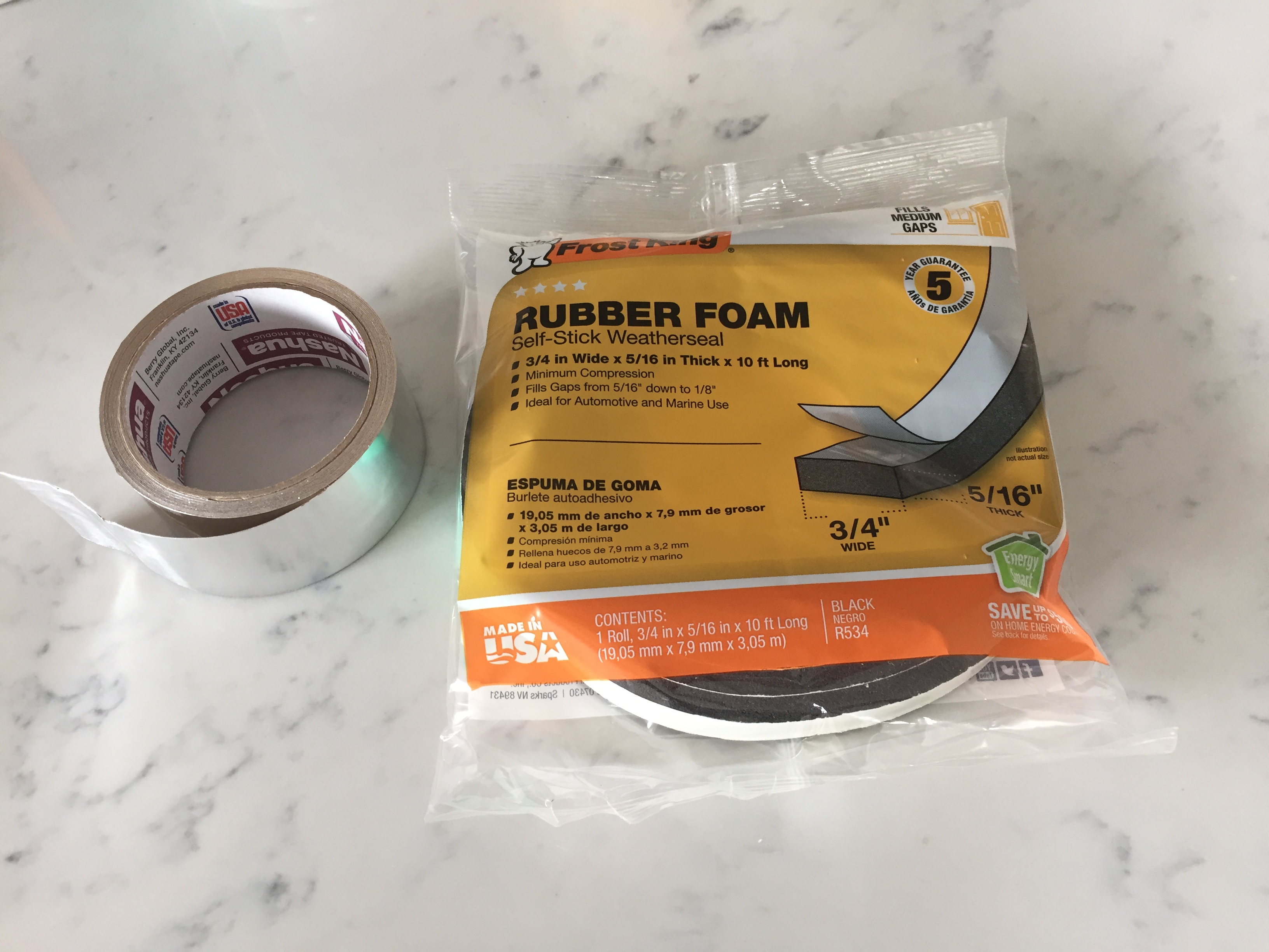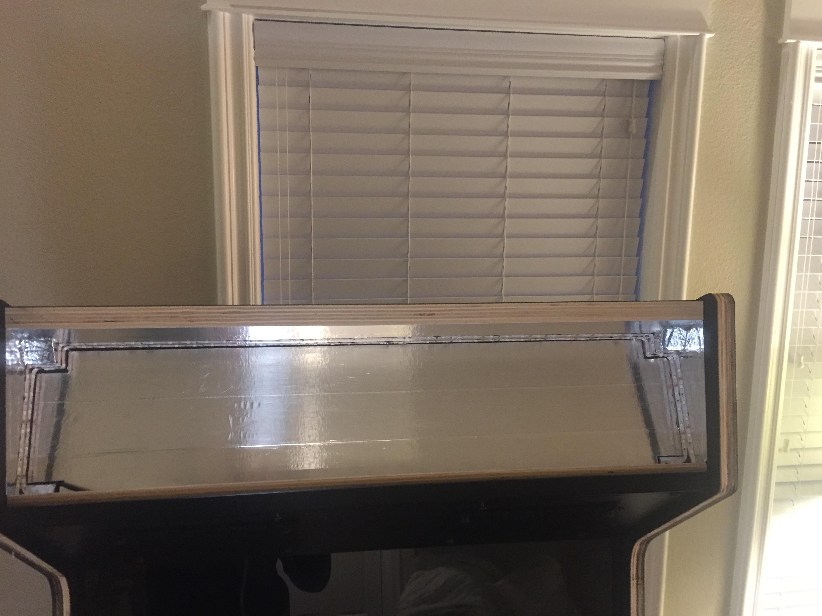 With the artwork in I got to preparing the marquee area. I hadn't closed it off or covered the speakers yet, but I didn't want any light to shine through the speaker grills. My problem was that with the TV extending all the way to the top of the inner cabinet (you'll be able to see this in pictures below) there is no room to access the speakers from behind in case they needed attention. In addition, I wanted an enclosed box to diffuse and reflect the light behind the marquee so that it would light up evenly. So, I bought some foil tape and rubber foam weather stripping: