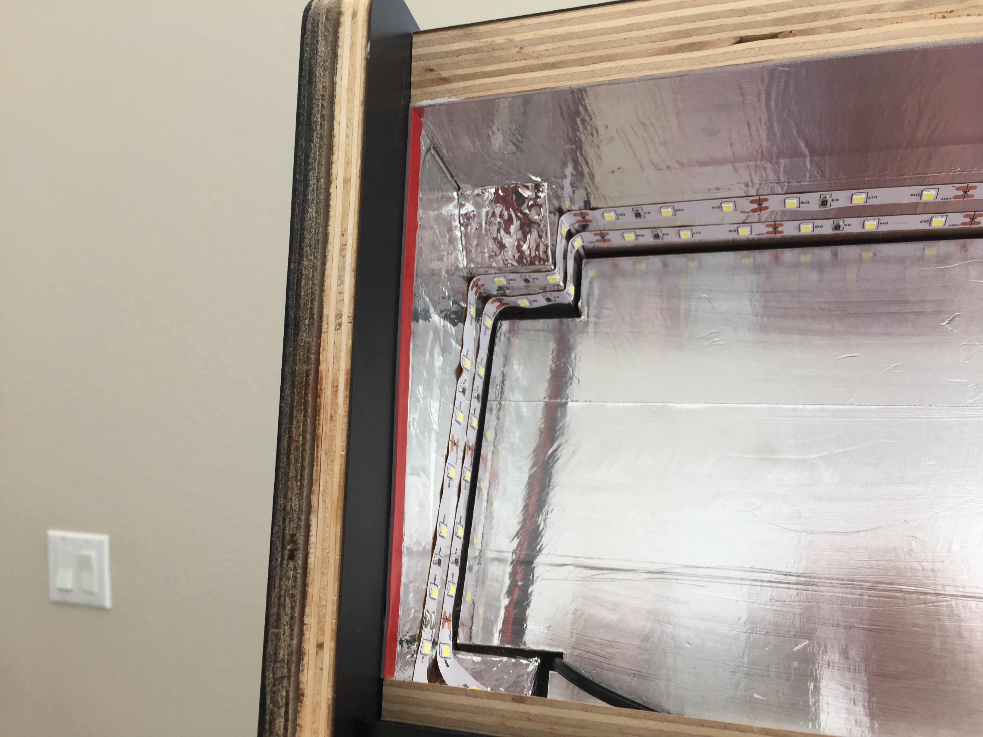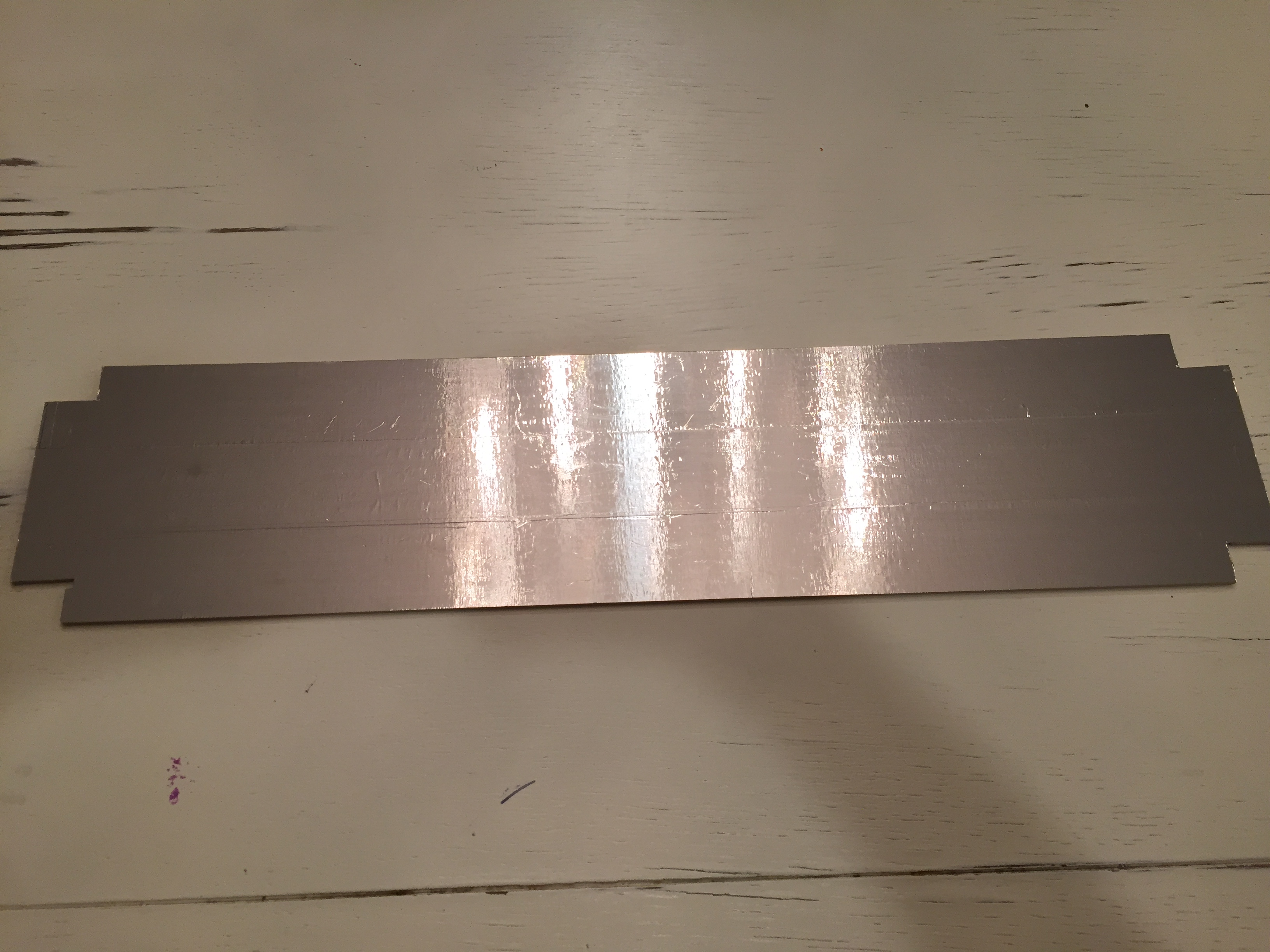 Next, with 1/8" MDF I measured and cut out a piece that would work as the back to the marquee box. I scribed the corners to accommodate for the batons. Then I covered the piece with foil tape: