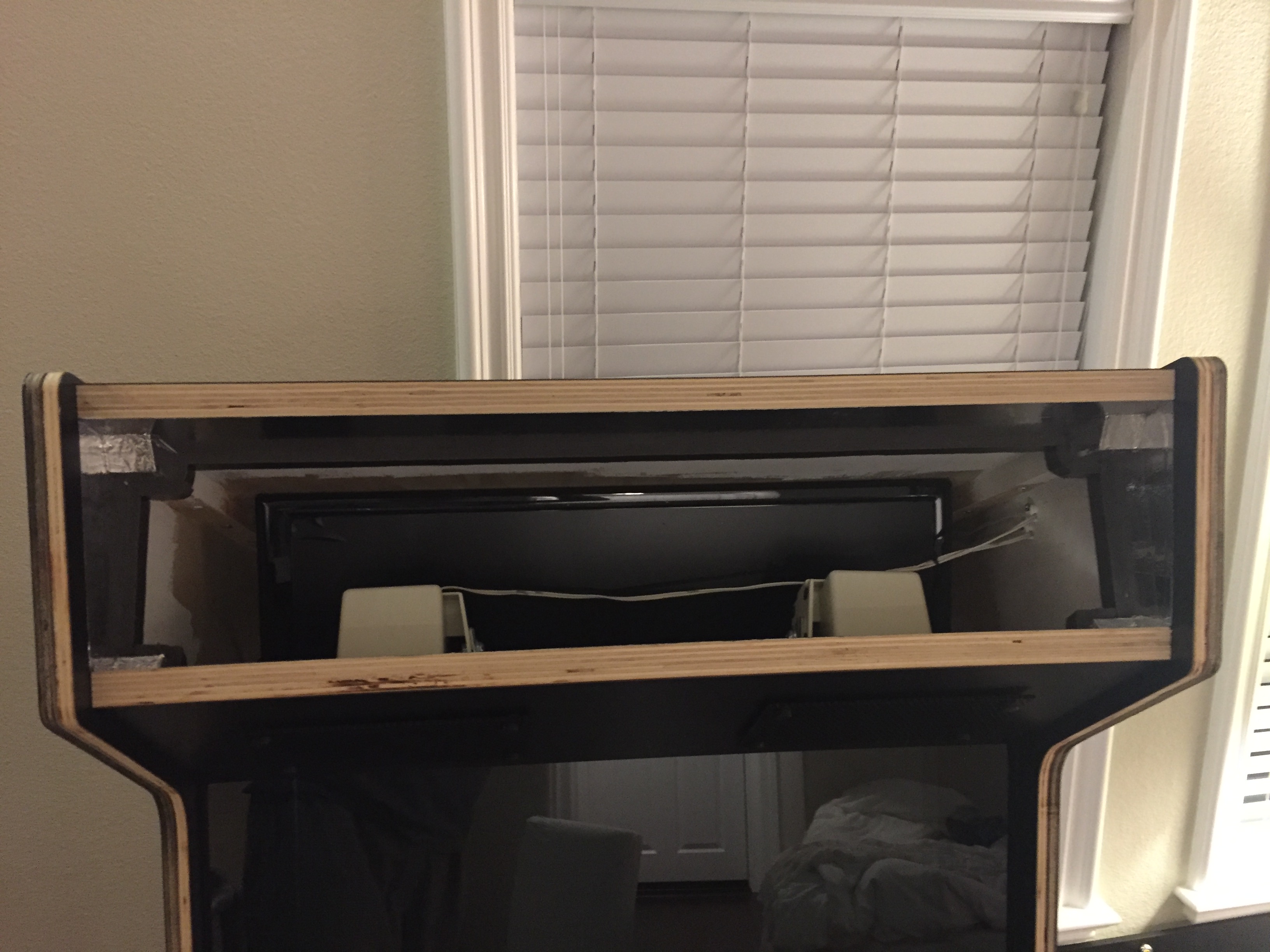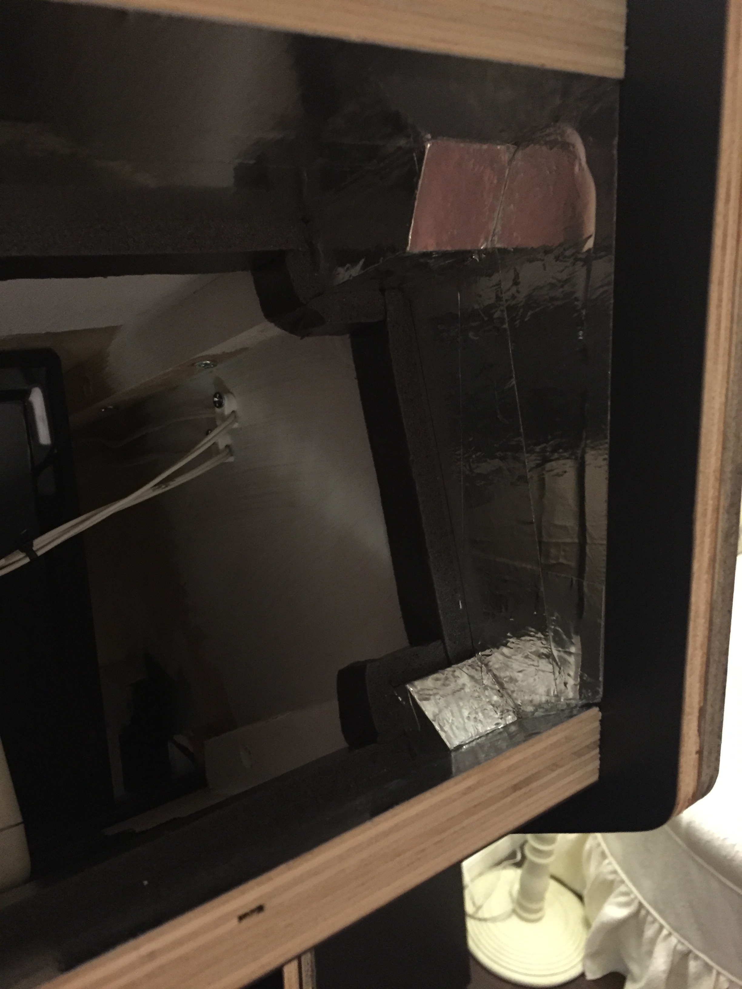 Gravity holds the board in place as it leans toward the back of the cabinet. The weather stripping is soft enough so that there aren't any cracks for light to sneak through while also eliminating the possibility of the board vibrating from sound. It's easily removable in case I have to work on the speakers. Problem solved!