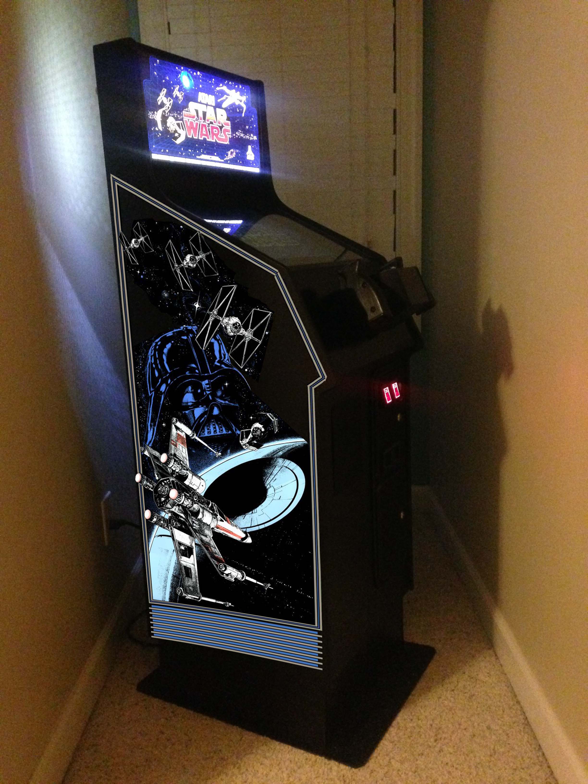 One more thing, and this might be more opinion than anything, but the original art filled up the sides. Yours leaves that top lip empty. I was thinking since this is a special cab, how about extending the space stars and outlines up there and perhaps finding another ship to insert into that area. Like, oh I don't know, the Millennium Falcon? ;)