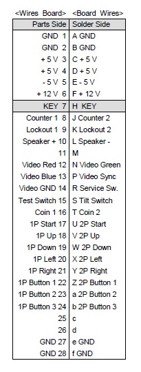 Also remember to adjust for the non-standard JAMMA harness wiring -- IIRC two pins on the board (27 and e?) are inputs instead of ground.