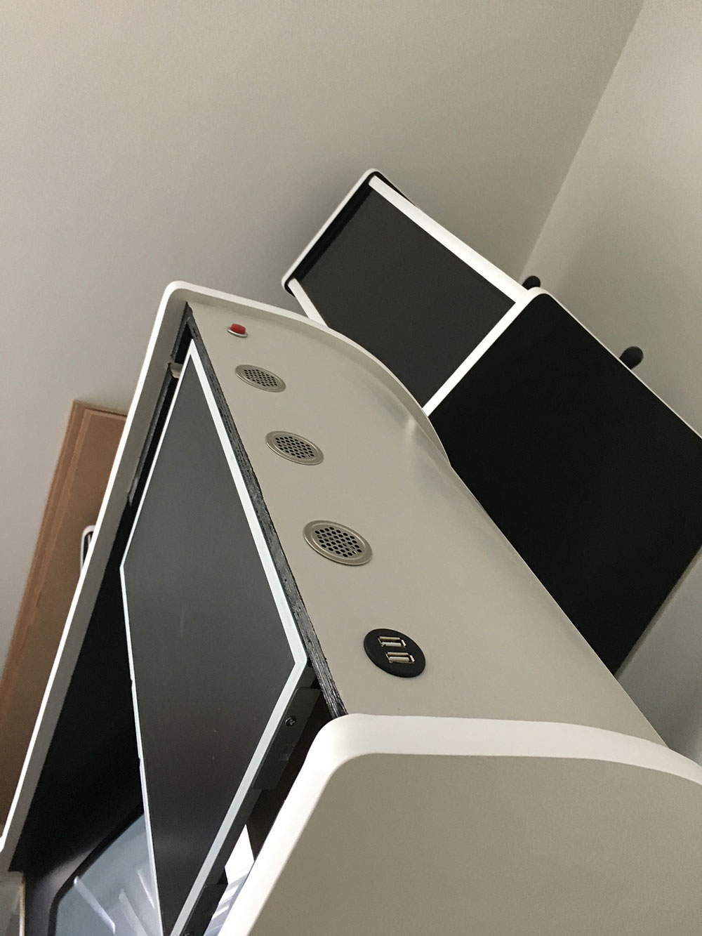 I’ve used grey speaker cloth in front of the speakers to offer some protection - it’s all held in with screws so should be fine. I’d also painted around the speaker holes with white satin, as this should hopefully(!) tie in with the artwork later.