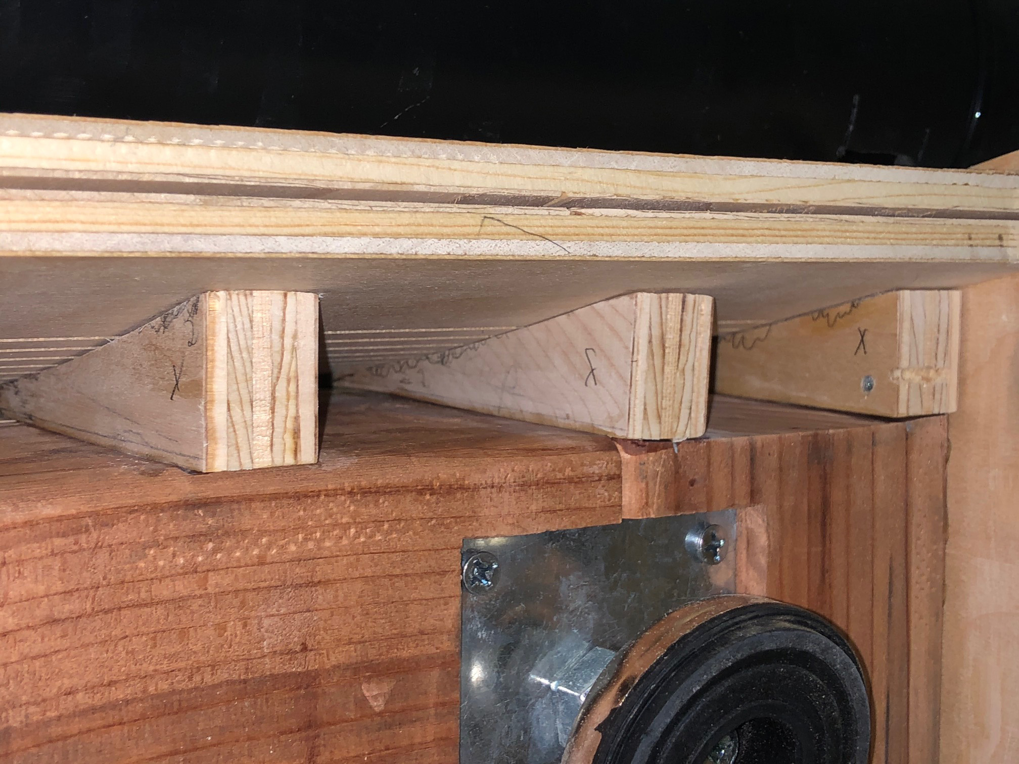 Repurposed the piece of plywood I used to practice kerfing as a support board for the middle which will hold the computer, amplifier, Arduino, and other electronics (slot cuts are on the underneath side).  Also cut the hole for and inserted the speaker terminals.