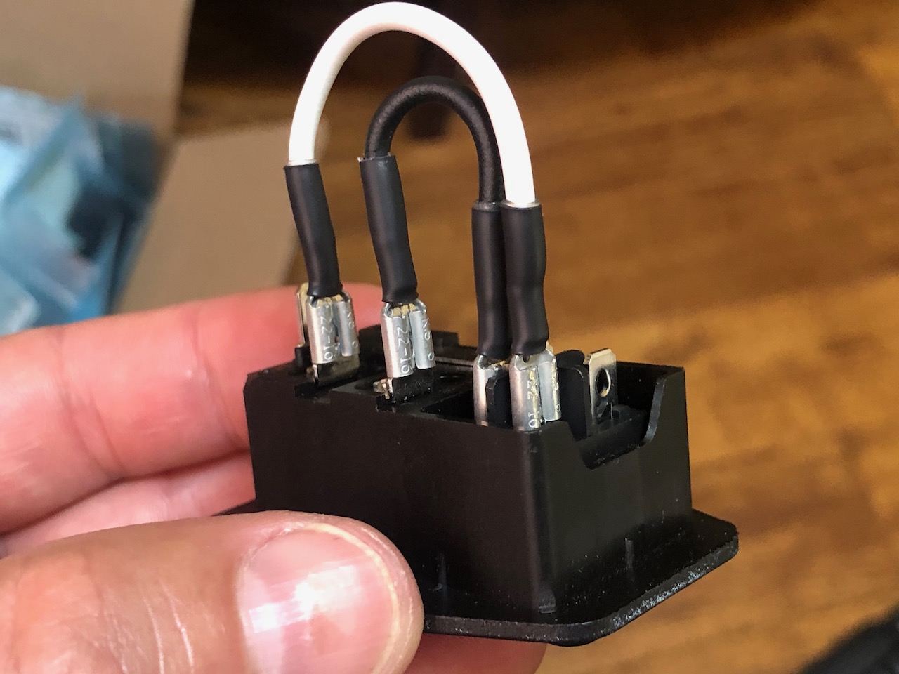 Next was wiring up the 120V outlet.  Used 16 gauge wire, 0.187” quick disconnects with shrink tubing to keep electrical insulation in place.