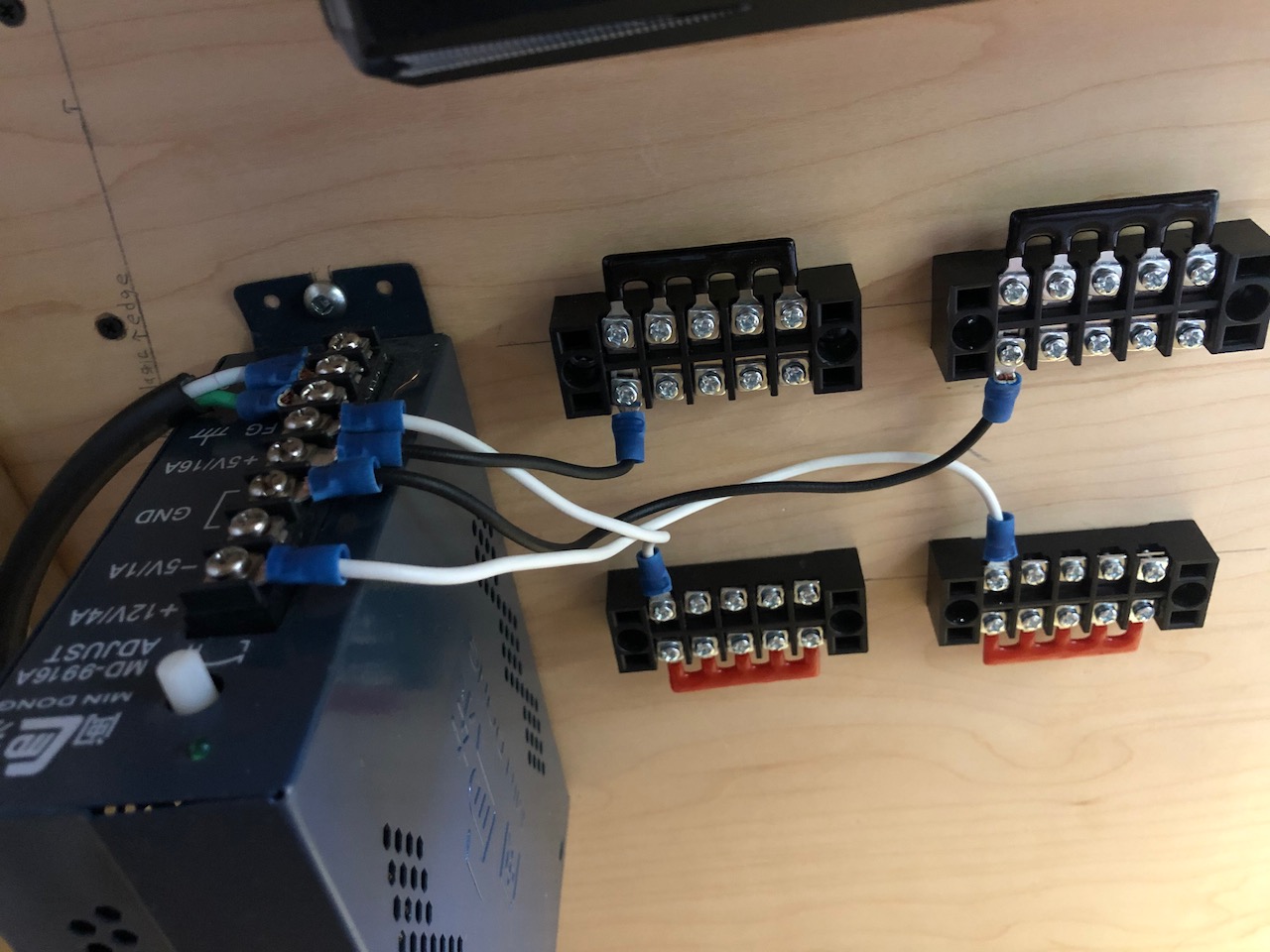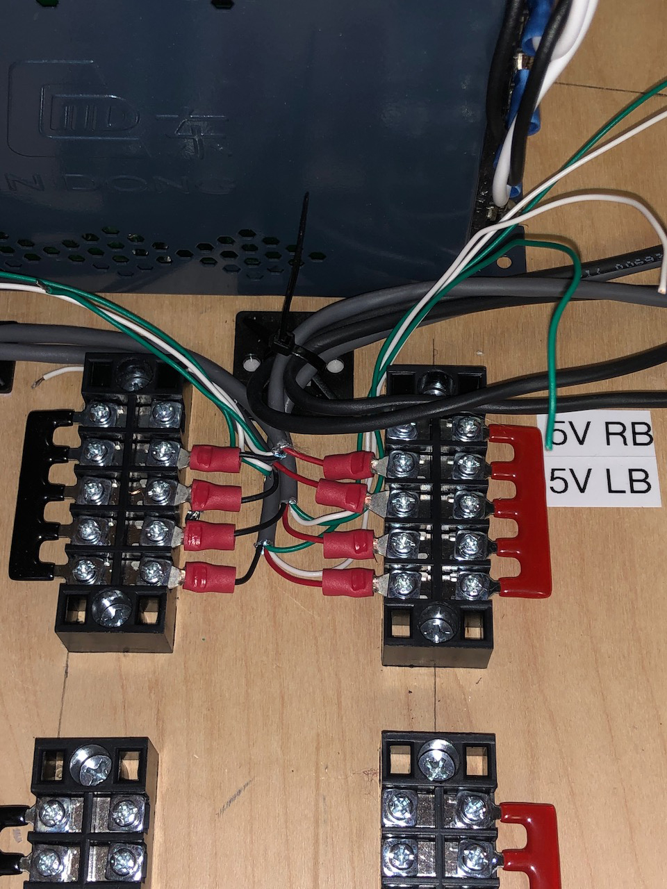This way I now have 4 additional terminals to connect the wires to for each voltage (ground up top in black, and positive in red).