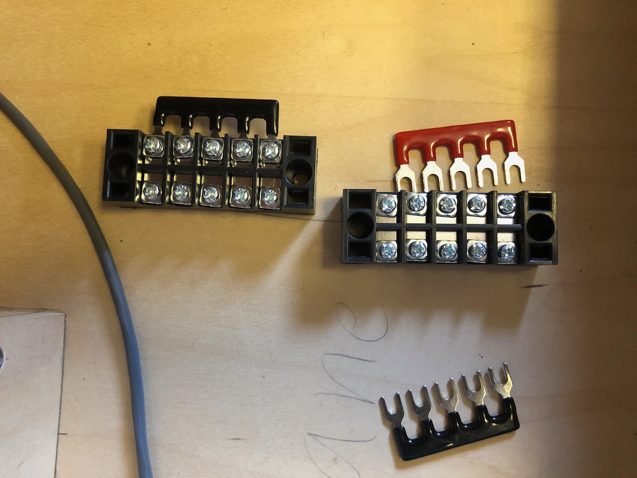 This way I now have 4 additional terminals to connect the wires to for each voltage (ground up top in black, and positive in red).
