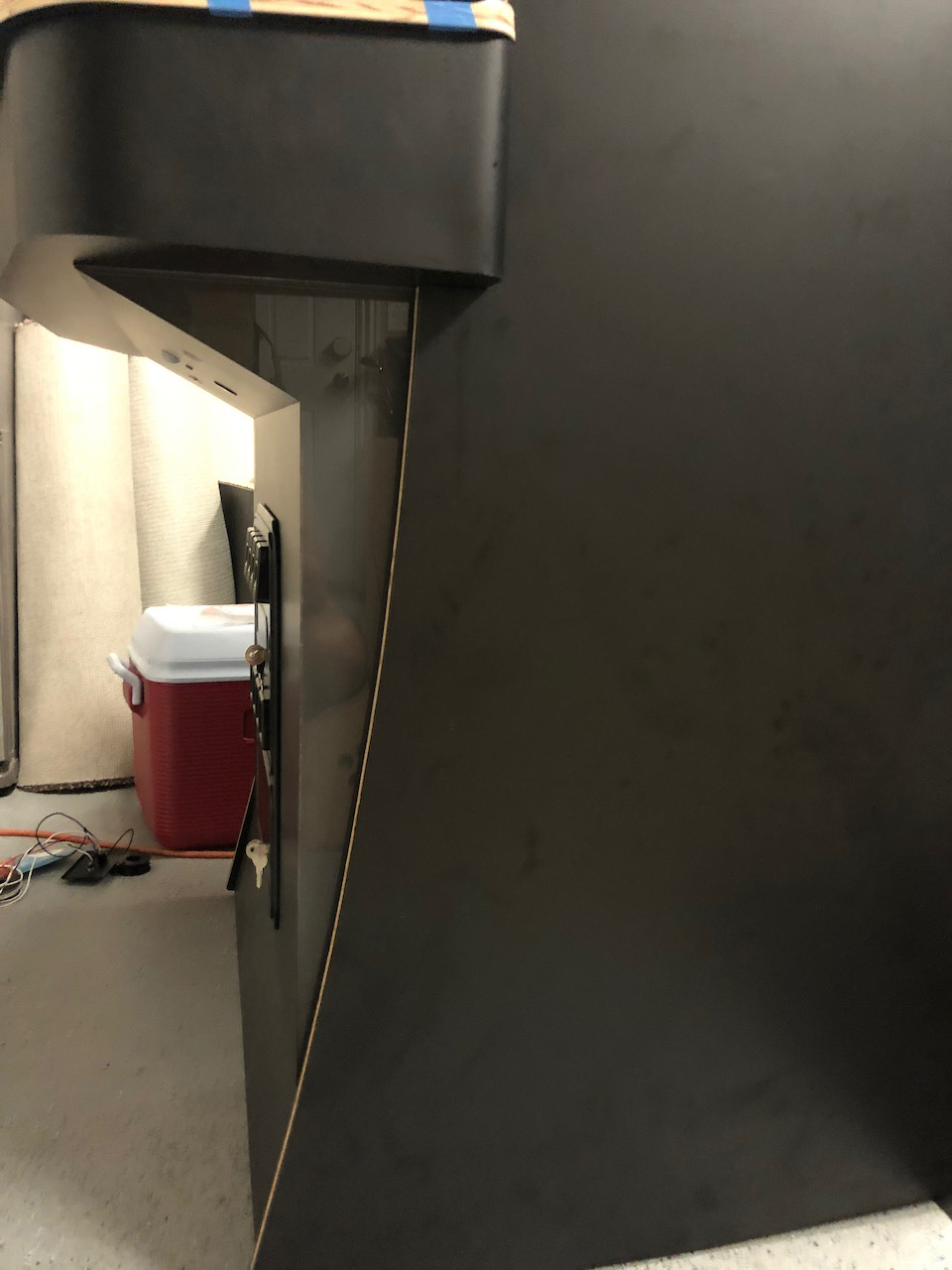 Finished off the back interior of the control panel.  I had mentioned over on wp34’s thread that I am using the “hinge” technique for a lot of laminating now.  In doing so I have learned that it is really helpful to mask off the surrounding sides with tape so that any excess contact cement can be lifted off.  This is very helpful when applying because if you leave the contact cement it can grab onto your piece and screw with your alignment:
