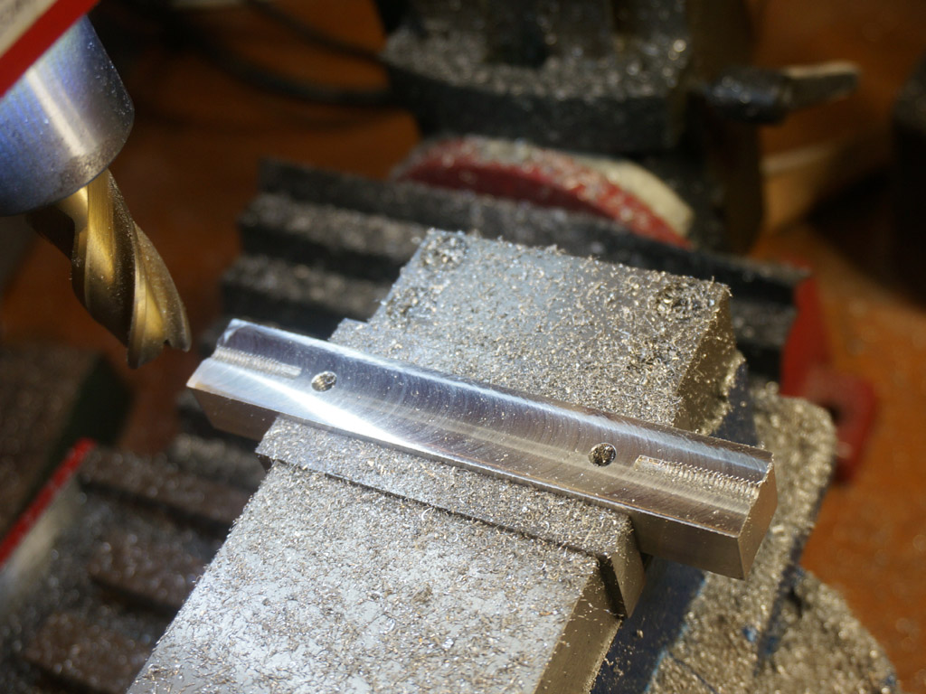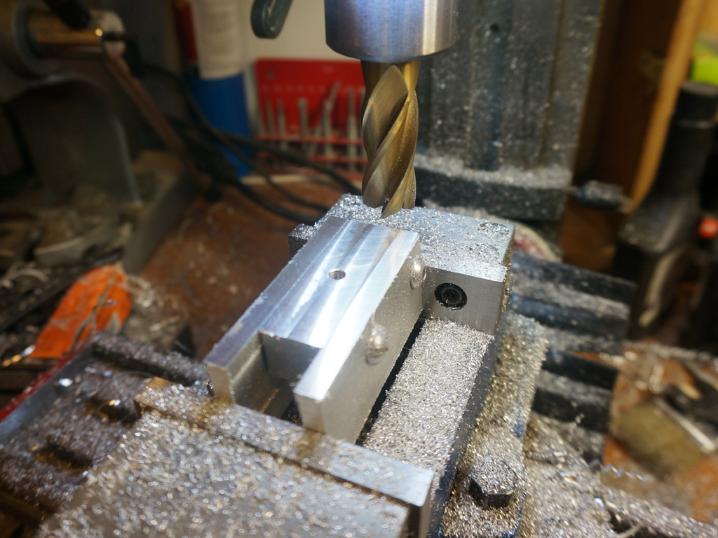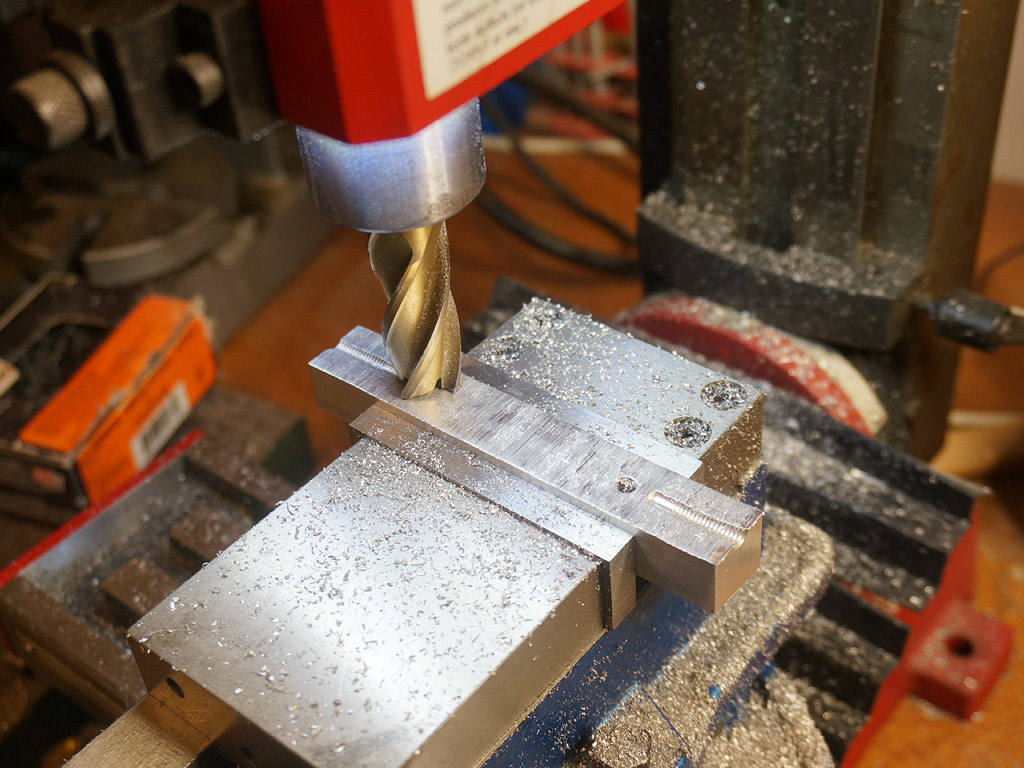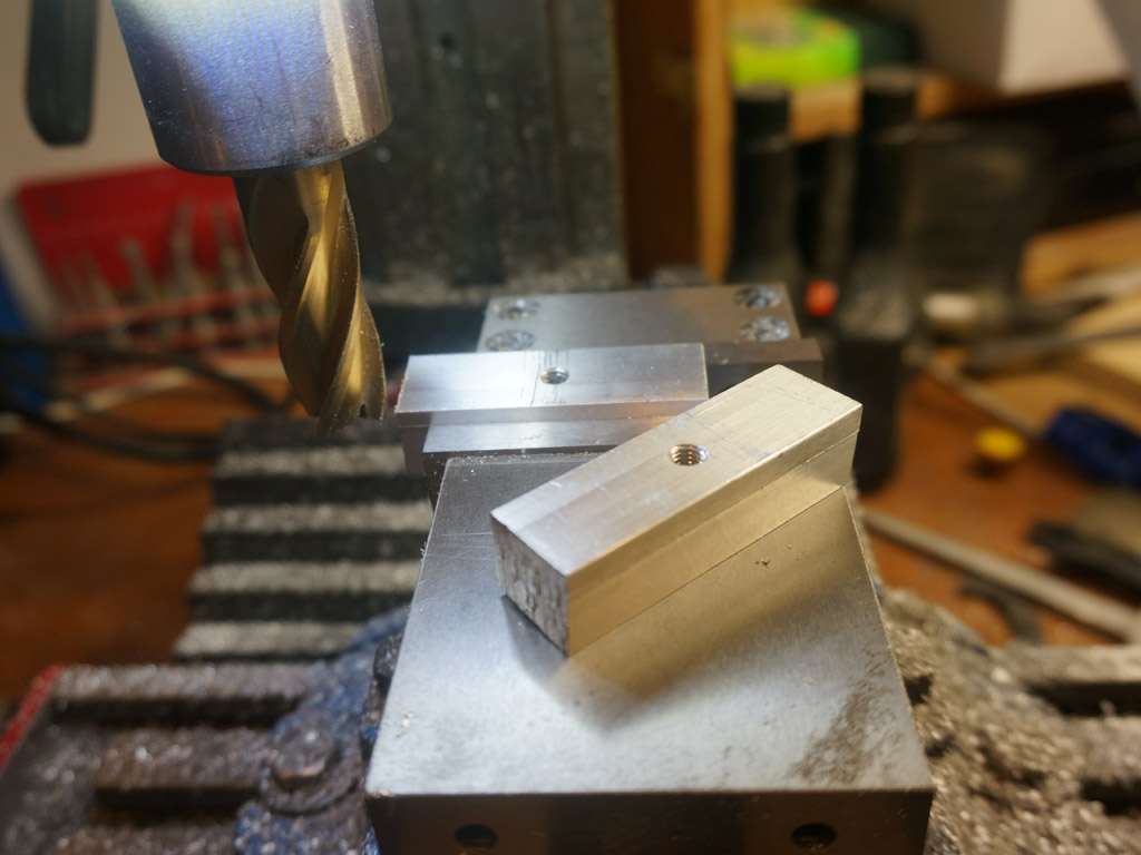 I drilled all my holes, screwed each clamp assembly tightly together over a plywood scrap as a spacer, and then grabbed it in the mill vice tilted at the 3' face angle I want...